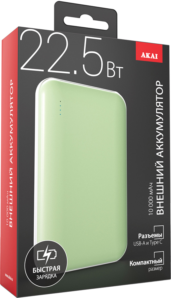 Стильное и мощное портативное зарядное устройство Akai BE-10017 ёмкостью 10 000 мА·ч поддерживает быструю зарядку 22,5 Вт. Поддерживаются протоколы быстрой зарядки Power Delivery и Quick Charge. LED-индикатор уровня заряда своевременно оповестит о необходимости пополнить заряд пауэрбанка. Компактный и лёгкий аксессуар удобно носить с собой. Портативное зарядное устройство Akai BE-10017 совместимо с различными гаджетами благодаря универсальному дизайну и поддержке основных стандартов зарядки.