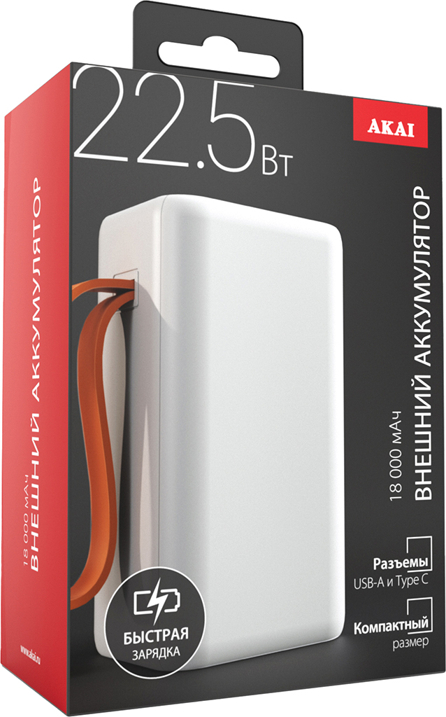 Надёжное и мощное портативное зарядное устройство Akai BE-20013 ёмкостью 18 000 мА·ч поддерживает быструю зарядку 22,5 Вт, оснащено двумя портами USB-A и двумя портами USB-C, что позволяет одновременно заряжать до трёх устройств. Поддерживаются протоколы быстрой зарядки Power Delivery и Quick Charge. Индикатор ёмкости и дисплей для отображения уровня заряда своевременно оповестят о необходимости пополнить заряд пауэрбанка. В модели установлена безопасная и долговечная литий-полимерная батарея.