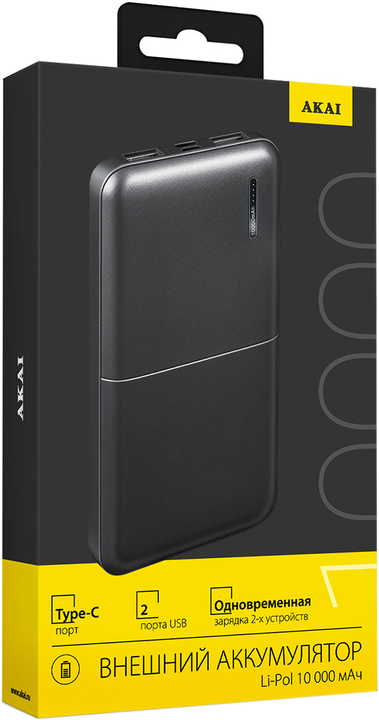 Портативное зарядное устройство AKAI емкостью 10000 mAh и мощностью 10,5 Вт — надежный источник энергии для всех видов ваших устройств. С поддержкой одновременной зарядки через два порта USB-A.