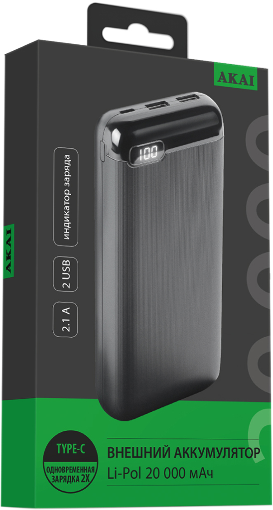 Портативное зарядное устройство AKAI емкостью 20000 mAh и мощностью 10,5 Вт — надежный источник энергии для всех видов ваших устройств. С поддержкой одновременной зарядки через два порта USB-A.