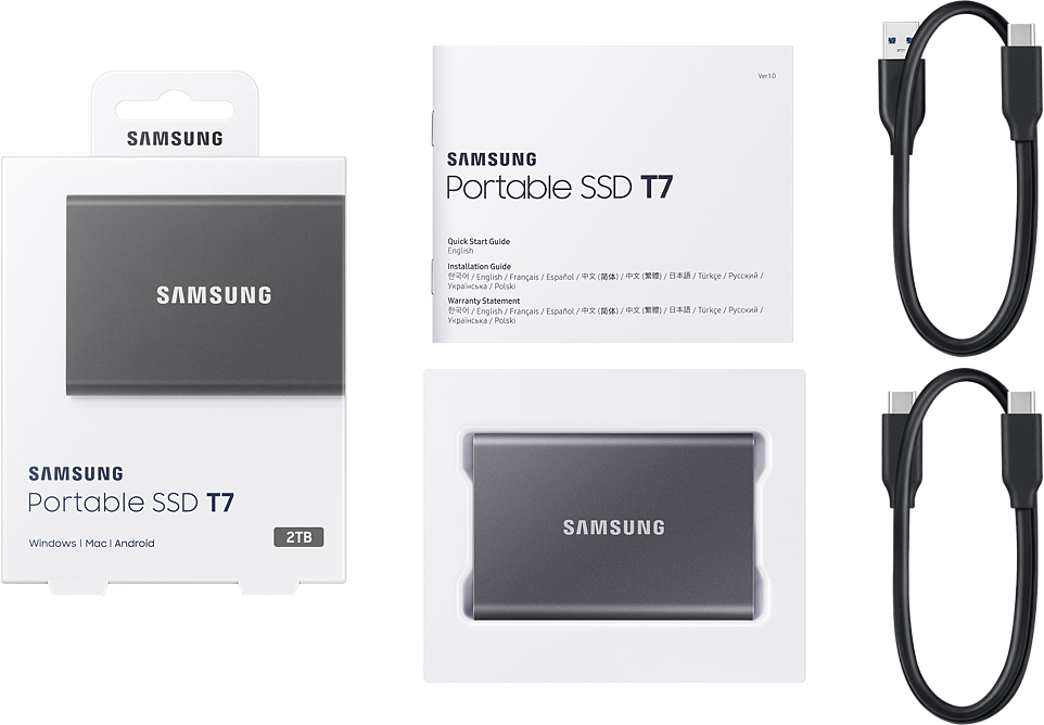 Новый стандарт для внешнего накопителя Легкий карманный накопитель Portable SSD T7 очень удобен для хранения и загрузки больших файлов. Используя накопитель Т7, вы по достоинству оцените повышение продуктивности вашей работы и получите удовольствие от развлекательного контента. Мгновенный перенос данных Высочайшая скорость SSD накопителя T7 с интерфейсом USB 3.2 Gen2 обеспечит практически мгновенный перенос ваших данных. Встроенная технология PCIe NVMe ускоряет процесс последовательного чтения/записи до значений порядка 1050/1000 MБ/сек., соответственно, благодаря этому быстродействие накопителя T7 почти в два раза превышает быстродействие предыдущего накопителя T5. Прочность конструкции и безопасность данных Аббревиатура SSD означает Solid State Drive (Твердотельный накопитель). Это означает, что в нем отсутствуют движущиеся детали. Безопасность данных в накопителе надежно обеспечена паролем с AES 256-битным шифрованием. Электроника накопителя защищена прочным металлическим корпусом, выдерживающим падение с высоты до 2 метров. Наконец, накопитель T7 Touch оснащен 3-летней ограниченной гарантией. Надежная защита от перегрева Пользуйтесь накопителем T7, не беспокоясь о проблеме перегрева. Улучшенная система защиты накопителя T7 от перегрева обеспечена технологией ePCM и динамической термозащитой Dynamic Thermal Guard, контролирующей температуру, благодаряя чему этот компактный SSD накопитель даже при высоких скоростях обмена данными сохраняет оптимальную температуру. Тонкий и компактный Стандартными признаками накопителя T7 Touch являются малая толщина и карманные размеры. Накопитель весит 58 грамм, а по размерам он напоминает кредитную карту. Благодаря элегантному и прочному алюминиевому корпусу, накопитель комфортно умещается в вашей руке. Выберите свой цвет и емкость накопителя Накопитель T7 предлагается разного объема и в разных цветовых решениях. Выберите для себя любой цвет, начиная от классического черного до синего и красного. Кроме того, вы можете выбрать накопитель наиболее подходящей для вас емкости: 500 ГБ, 1 ТБ или 2 ТБ. Универсальная совместимость Доступ к вашим файлам в любое время из любого места. Накопитель T7 совместим с Windows ПК, Mac, Android устройствами, игровыми консолями и многими другими устройствами. В комплект поставки накопителя включены кабели USB Type C-> C и переходник Type C->-A . ПО управления накопителем Накопитель T7 поставляется со встроенным обновленным ПО для PC и Mac ОС, что позволяет установить пароли и получать последние обновления программного обеспечения. Вы также можете загрузить мобильное приложение для смартфонов и планшетов с ОС Android. Флэш накопитель No. 1 в мире Оцените превосходные рабочие характеристики и надежность SSD накопителя от ведущего мирового лидера - производителя систем памяти с 2002 года. Все программное обеспечение и электронные компоненты, включая всемирно-известные модули памяти Samsung DRAM и NAND, разработаны и произведены на собственных предприятиях компании, что позволяет их интегрировать в системы памяти с высочайшим уровнем надежности, которому можно доверять.