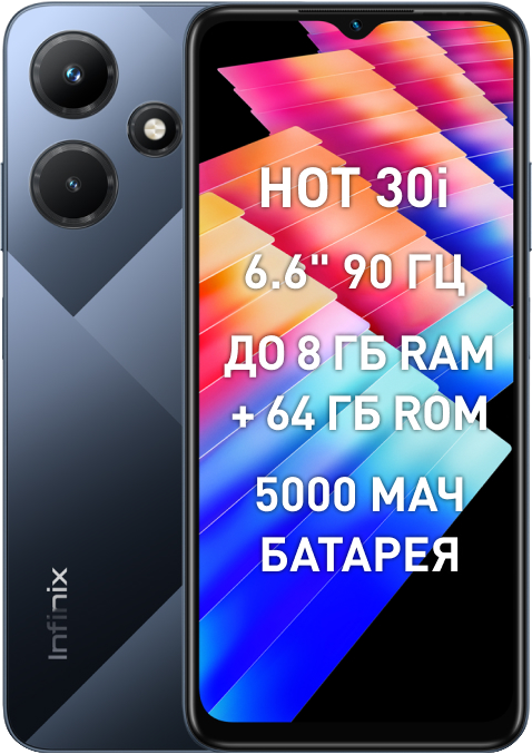 Infinix HOT 30i — портал в мир развлечений. Доступный смартфон для игр. Плавность движений. Наслаждайтесь суперплавным интерфейсом с 90-герцовым ярким экраном. Технология усиления тёмных зон (DRE) и пиковая яркость в 500 нит позволят вам с комфортом пользоваться смартфоном как в домашних условиях, так и на улице.Пользуйтесь своим смартфоном от рассвета до заката. Благодаря ёмкости аккумулятора 5000 мА*ч смартфон уверенно проработает весь день, а быстрая зарядка на 18 Вт поможет быстро восполнить энергию.