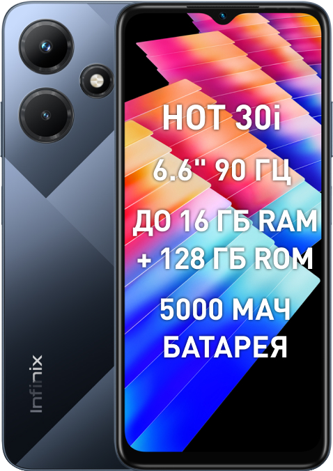 Infinix HOT 30i — портал в мир развлечений. Доступный смартфон для игр. Плавность движений. Наслаждайтесь суперплавным интерфейсом с 90-герцовым ярким экраном. Технология усиления тёмных зон (DRE) и пиковая яркость в 500 нит позволят вам с комфортом пользоваться смартфоном как в домашних условиях, так и на улице.Пользуйтесь своим смартфоном от рассвета до заката. Благодаря ёмкости аккумулятора 5000 мА*ч смартфон уверенно проработает весь день, а быстрая зарядка на 18 Вт поможет быстро восполнить энергию.