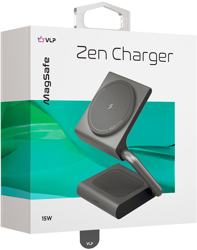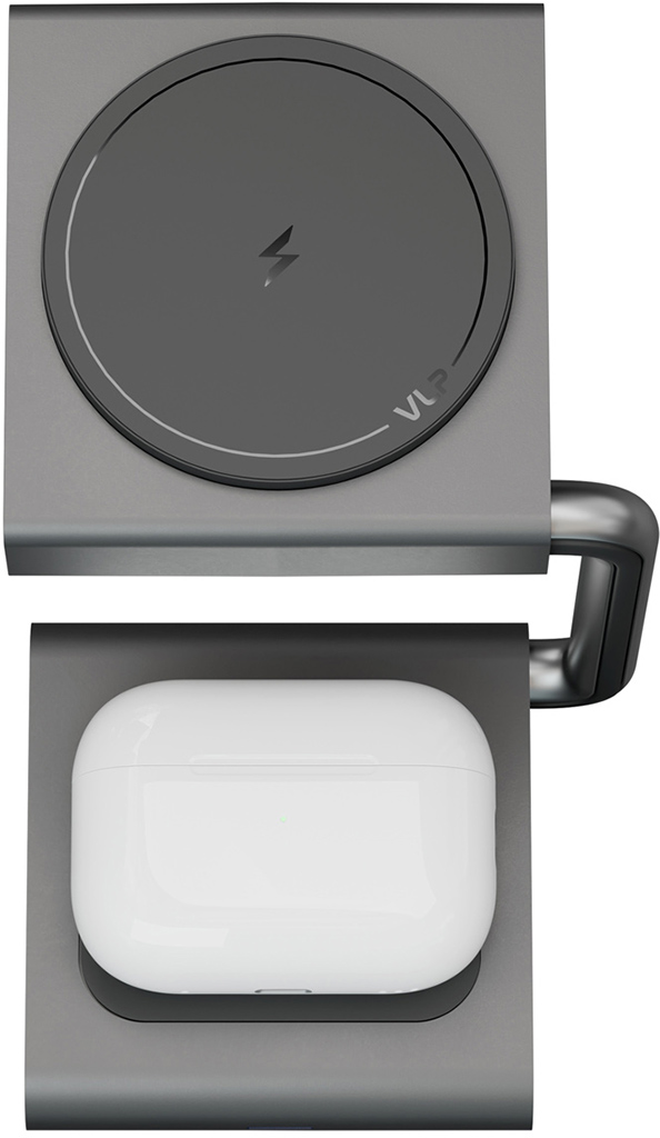 Беспроводное зарядное устройство с функцией подставки позволяет заряжать одновременно три устройства: два — с поддержкой беспроводной зарядки и одна — по кабелю. Поддерживает технологию MagSafe, современные протоколы быстрой зарядки — USB Power Delivery, QC 3.0 — и протокол беспроводной зарядки QI. Максимальная мощность зарядки смартфона — 15 Вт, наушников — 2,5 Вт. Есть светодиодная индикация.