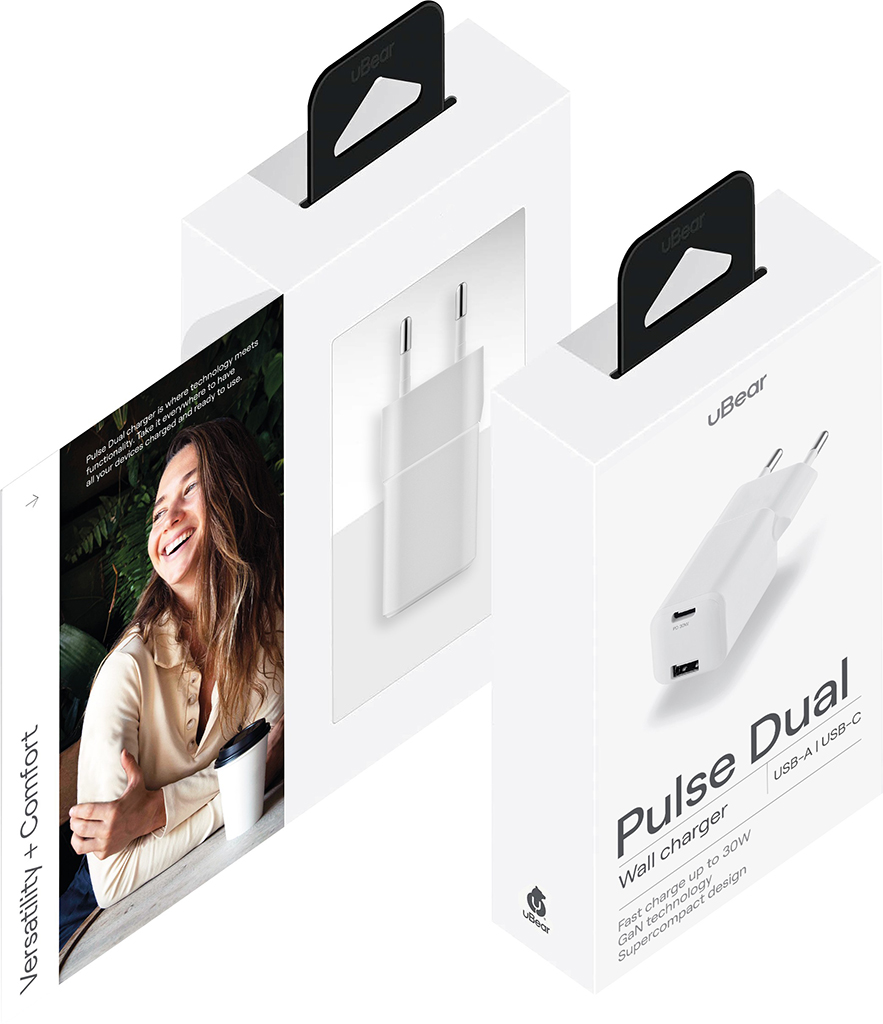 uBear Pulse Dual — ультракомпактное зарядное устройство нового поколения, позволяющее одновременно заряжать два гаджета с высокой мощностью — до 30 Вт. Инновационный чип с нитридом галлия (GaN), а также передовые стандарты QC 3.0 и Power Delivery гарантируют быструю зарядку для обоих устройств. Умная регулировка распределения тока подбирает оптимальную мощность для каждого из них. Полная поддержка MagSafe гарантирует полную совместимость с устройствами Apple — iPhone, iPad Pro и MacBook Air.