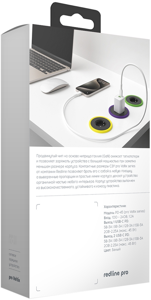 Сетевое зарядное устройство Red Line оборудовано чипом на основе нитрида галлия (GaN), который снижает теплопотери и позволяет заряжать устройства с большей мощностью при заметно меньшем размере корпуса. Компактные размеры позволяют брать зарядное устройство с собой, куда бы вы ни отправились. Просто положите его в карман или сумку — и отправляйтесь по своим делам. Быстрая зарядка для ваших устройств всегда будет под рукой.