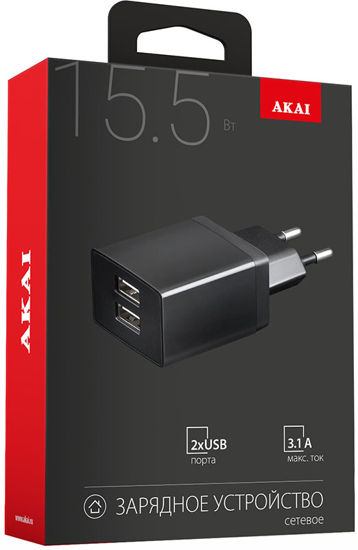 Сетевое зарядное устройство Akai обладает интеллектуальной системой распределения тока между подключёнными устройствами в зависимости от их характеристик. Аксессуар компактен и удобен в использовании, имеет защиту от короткого замыкания, перегрева, перегрузки по току, высокого напряжения и падения напряжения.