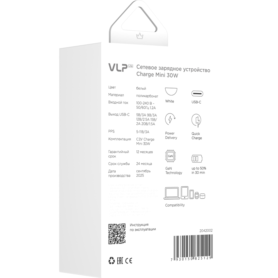 Сетевое зарядное устройство VLP Charge Mini с портом USB-C может зарядить смартфон на 50% за 30 минут, а также подходит для зарядки пауэрбанков, планшетов, игровых консолей, ноутбуков, наушников, умных часов и пр. Модель поддерживает технологии быстрой зарядки Power Delivery 3.0 и Qualcomm QuickCharge 2.0/3.0. Устройство имеет встроенную защиту от короткого замыкания, перегрева, перезаряда элементов питания, превышения допустимого напряжения и силы тока подключённых устройств.