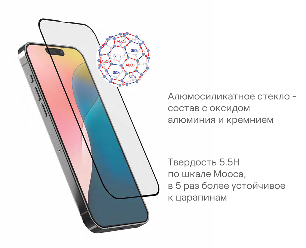 Ультратонкое алюмосиликатное стекло uBear Extreme 3D Shield полностью закрывает дисплей iPhone. Основной состав из оксида алюминия и кремния с обработкой ионами калия делает это стекло более ударопрочным и устойчивым к царапинам. Прозрачность более 93% — одна из лучших на рынке, не искажает цвета и сохраняет высокую чувствительность и отклик экрана. Японское стекло Asahi Glass толщиной всего 0,3 мм обладает превосходным показателем твёрдости — более 5,5 балла по шкале Мооса.