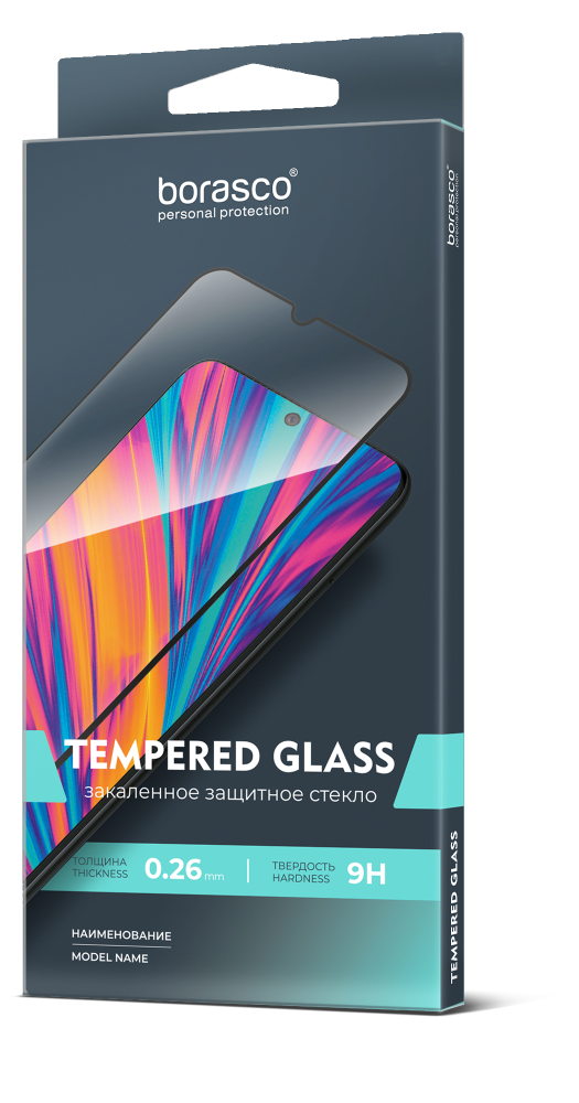 Защитное стекло BoraSCO изготовлено из высокопрочного закалённого стекла (твёрдость 9H), имеет алюмосиликатный клеевой слой. У этой модели закруглённые края и чёрная рамка.