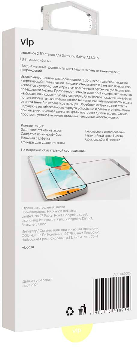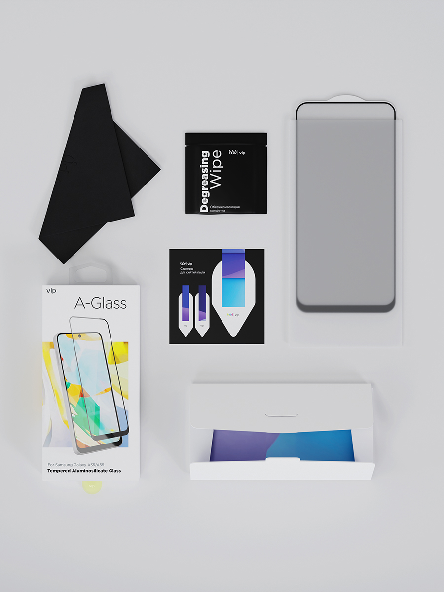 VLP A-Glass для смартфонов Samsung Galaxy А35 и A55 — высококачественное алюмосиликатное защитное стекло 2.5D с двойной закалкой — термической и химической. Его толщина — всего 0,3 мм, а прозрачность — более 95%. Олеофобное покрытие, нанесённое по технологии гальванизации, позволяет легко очищать поверхность от загрязнений и отпечатков пальцев.