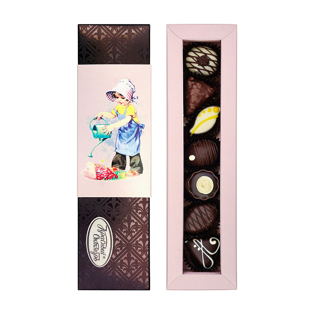 Тёмный шоколад (сахар, какао тертое, масло какао, жир молочный, эмульгаторы: лецитин соевый, Е476; ароматизатор «Ваниль»), сахар, молочный шоколад (сахар, какао тертое, масло какао, сухое цельное молоко, эмульгаторы: лецитин соевый, Е476; ароматизатор «Ванильный»), тёмный шоколад (сахар, какао тёртое, масло какао, эмульгатор лецитин соевый, ароматизатор «Ваниль»), марципановая масса (ядро ореха миндаля тертое, сахар, инвертированный сахар), белый шоколад (сахар, масло какао, сухое цельное молоко, эмульгаторы: лецитин соевый, Е476; соль, ароматизаторы: «Ваниль» и «Коньячный»), ядро ореха миндаля тертое, сухое цельное молоко, заменитель молочного жира (рафинированные дезодорированные растительные масла: пальмовое масло, частично гидрогенизированное пальмовое масло, соевое масло, антиокислители: лимонная кислота, аскорбилпальмитат, токоферолы, концентрат смеси, лецитин подсолнечника), масло какао, ядро ореха фундука дробленое, эквивалент масла какао (рафинированные, дезодорированные, фракционированные, негидрогенизированные растительные масла (пальмовое, ши)), жир специального назначения (растительные негидрогенизированные масла: пальмовое масло, масло ши, эмульгатор лецитин подсолнечника), жир специального назначения (негидрогенизированные растительные масла: пальмовое, ши), патока, вафли (вода питьевая, мука пшеничная хлебопекарная высшего сорта, сахар, соль, эмульгатор лецитин соевый, масло подсолнечное рафинированное дезодорированное, разрыхлитель гидрокарбонат натрия), ядро ореха миндаля целое, сгущённое с сахаром молоко (цельное молоко, сахар), какао-порошок, отделочный полуфабрикат «шоколад в форме хлопьев» (сахар, какао тёртое, масло какао, сухое цельное молоко, жир молочный, натуральный ароматизатор ваниль), коньяк (0,4%), ядро ореха фундука тертое, спирт этиловый ректификованный (0,2%), ядро ореха миндаля дроблёное, сухое обезжиренное молоко, вода питьевая, какао тертое, эмульгатор лецитин соевый, ароматизаторы: «Ваниль», «Крем-ликёр», «Апельсин», «Кофе», «Кофе капучино», «Миндаль сладкий», «Вишня в шоколаде», «Миндаль»; консервант Е202, красители: Е141 и Е100. Противопоказано при индивидуальной непереносимости белка молока.
