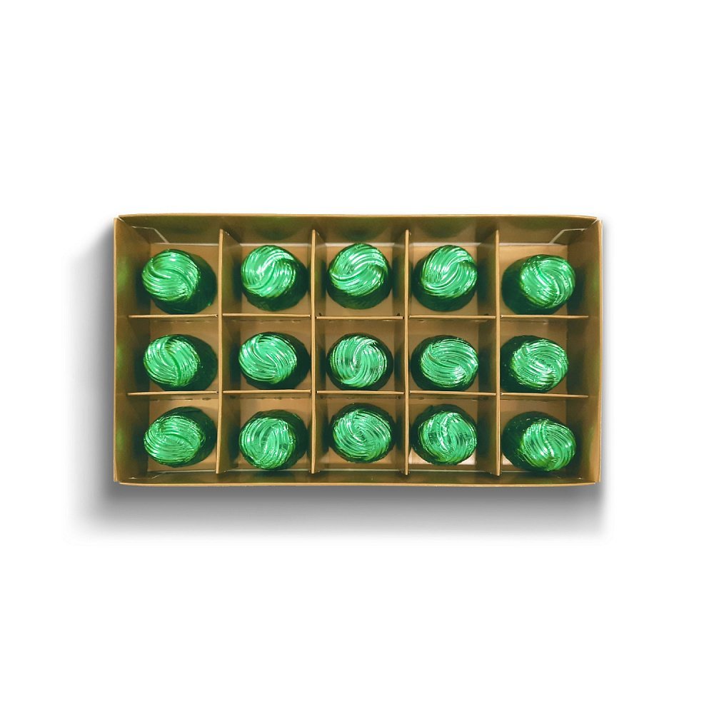 Конфеты №51 – шоколадные конфеты круглой формы из тёмного шоколада, с молочно-ликёрной начинкой с вишневым вкусом. Поверхность декорирована белым шоколадом, подкрашенным зеленым цветом.