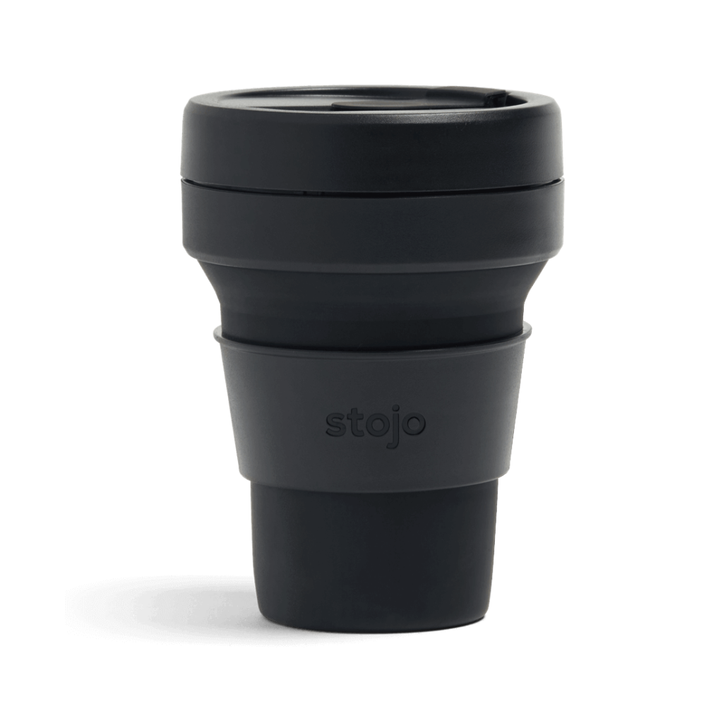 Это — Stojo INK чёрного цвета. Крышка, ободок и держатель изготовлены из пищевого полипропилена — пластика, который не содержит бисфенол А (BPA), бисфенол С (BPS), свинец, фталаты, поливинилхлорид (PVC) и кадмий. А корпус и клапан изготовлены из прочного пищевого силикона (LFGB certified silicone rubber). Такой стакан можно сдать на переработку после окончания использования.