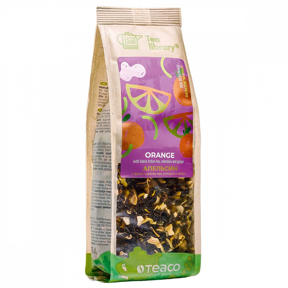 чай черный, цедра апельсина, Календула цветок, Имбирь крупный помол, Цветки апельсинового дерева, натуральный ароматизатор.