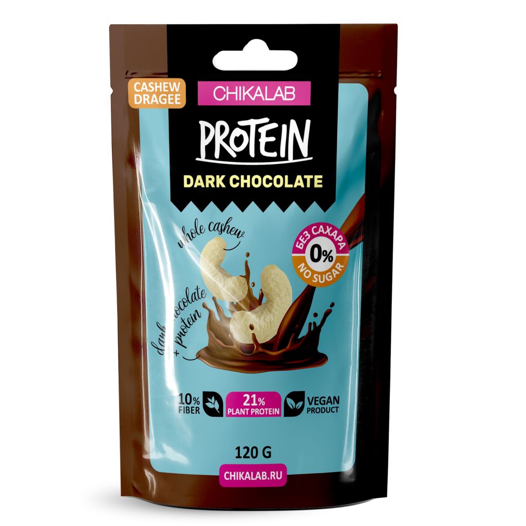 кешью, темный шоколад (какао тёртое, масло какао, белковая смесь (изолят горохового белка, изолят тыквенного белка), водорастворимые волокна кукурузы, олигофруктоза (пищевые волокна),  инулин (пищевые волокна), эмульгатор (соевый лецитин), глянцеватель.