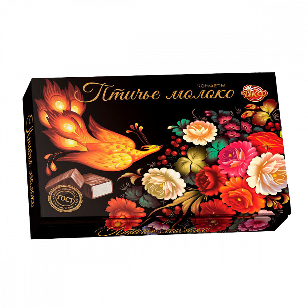 Нежные воздушные конфеты в коробке Птичье молоко изготовлены по ГОСТ 4570. Сливочно-ванильное суфле, покрытое темной шоколадной глазурью.
