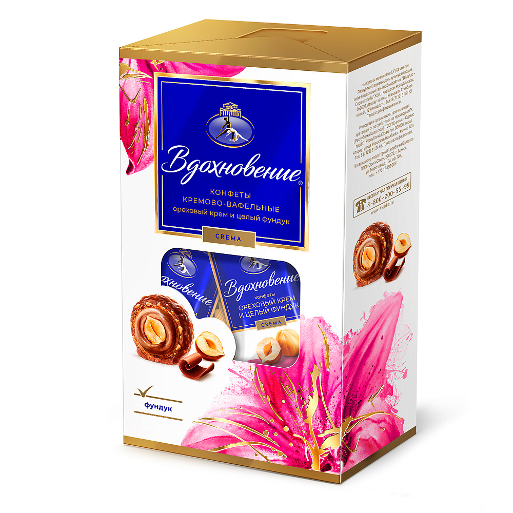 Конфеты Вдохновение - цельное ядро фундука, окутанное нежным кремом, спрятано в хрустящую вафельную скорлупку, покрытую шоколадом.