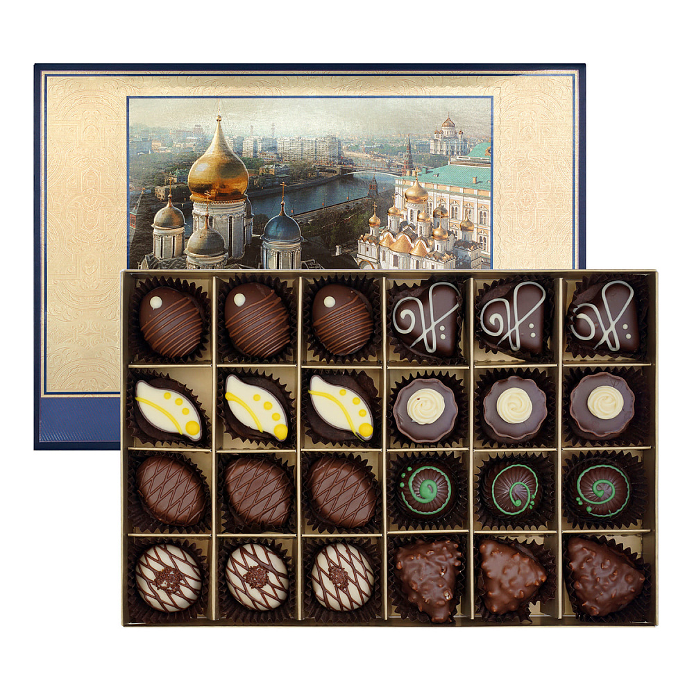 молочный шоколад (сахар, какао тертое, масло какао, сухое цельное молоко, эмульгаторы: лецитин соевый, Е476, ароматизатор «Ванильный»), сахар, тёмный шоколад (сахар, какао тертое, масло какао, эмульгатор лецитин соевый, ароматизатор «Ваниль»), тёмный шоколад (сахар, какао тертое, масло какао, жир молочный, эмульгаторы: лецитин соевый, Е476; ароматизатор «Ваниль»), марципановая масса (ядро ореха миндаля тертое, сахар, инвертированный сахар), белый шоколад (сахар, масло какао, сухое цельное молоко, эмульгаторы: лецитин соевый, Е476; соль, ароматизаторы: «Ваниль», «Коньячный»), ядро ореха миндаля тертое, сухое цельное молоко, заменитель молочного жира (рафинированные дезодорированные растительные масла: пальмовое масло, частично гидрогенизированное пальмовое масло, соевое масло, антиокислители: лимонная кислота, аскорбилпальмитат, токоферолы, концентрат смеси, лецитин подсолнечника), вафли (вода питьевая, мука пшеничная хлебопекарная высшего сорта, сахар, соль, эмульгатор лецитин соевый, масло подсолнечное рафинированное дезодорированное, разрыхлитель гидрокарбонат натрия), масло какао, жир специального назначения (негидрогенизированные растительные масла: пальмовое, ши), ядро ореха фундука дробленое, вода питьевая, эквивалент масла какао (рафинированные, дезодорированные, фракционированные, негидрогенизированные растительные масла (пальмовое, ши)), жир специального назначения (растительные негидрогенизированные масла: пальмовое масло, масло ши, эмульгатор лецитин подсолнечника), патока, сгущенное с сахаром молоко (цельное молоко, сахар), какао-порошок, отделочный полуфабрикат «шоколад в форме хлопьев» (сахар, какао тёртое, масло какао, сухое цельное молоко, жир молочный, ароматизатор натуральный «Ваниль»), коньяк (0,4%), ядро ореха фундука тертое, спирт этиловый ректификованный (0,2%), ядро ореха миндаля дробленое, сухие сливки, сухое обезжиренное молоко, эмульгатор лецитин соевый, ароматизаторы: «Крем-ликер», «Вишня в шоколаде», «Ваниль», «Апельсин», «Карамель-крем», «Кофе», «Кофе капучино», «Миндаль», какао тёртое, консервант Е202, красители Е141, Е100. Противопоказано при индивидуальной непереносимости белка молока.