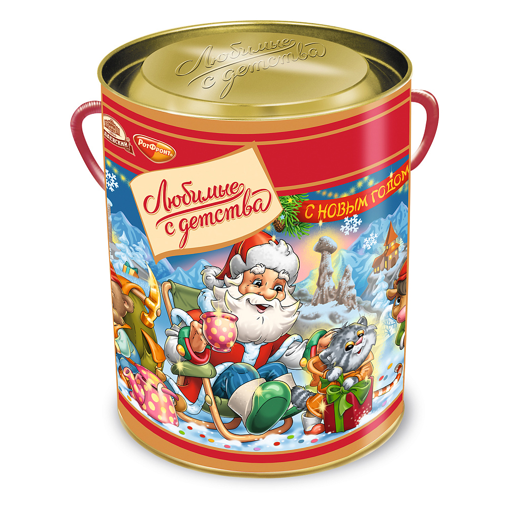 Компактная туба с жестяной крышкой, стилизованная под новогодние подарки 50-х годов. Любимые с детства конфеты легендарных российских фабрик – отличный вариант подарка как для детей, так и для взрослых.