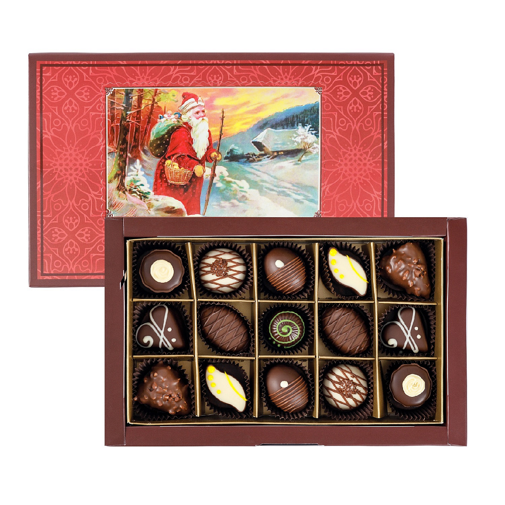 Ассорти глазированных шоколадных конфет с декором ручной работы. Коробка в виде старинной открытки, можно подписать без нарушения упаковки.