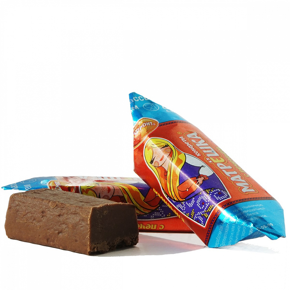 Конфеты Матрёшка фабрики Рот Фронт - широкие пластины вафель с кремовой прослойкой с насыщенным ореховым вкусом, покрытые глазурью.