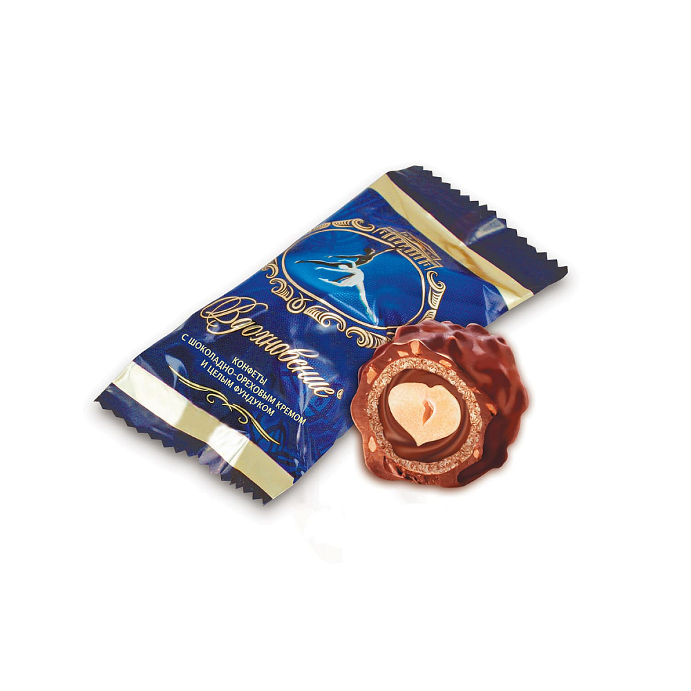 Хрустящий вафельный шарик с воздушным шоколадным кремом, который заботливо кутает ядро орешка. Покрыт шоколадной глазурью с дробленым орехом.