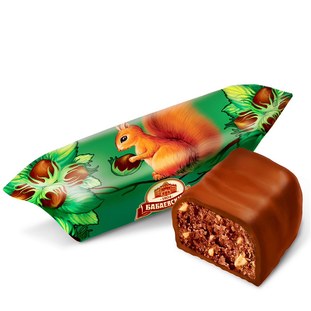 Любимая с советских времен Белочка, начинка с мелкими кусочками нескольких видов орехов и шоколадная глазурь.