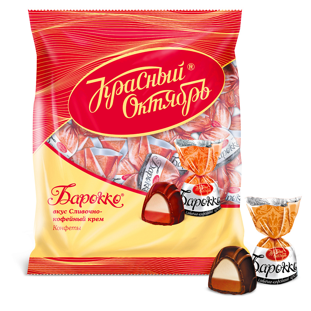 Конфеты Барокко сливочно-кофейный крем - нежная кремово-желейная начинка из двух слоев, сливочного и кофейного в шоколадной глазури.