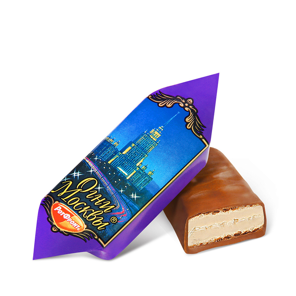 Конфеты глазированные Огни Москвы с нежной начинкой между слоями вафель от фабрики Рот Фронт.