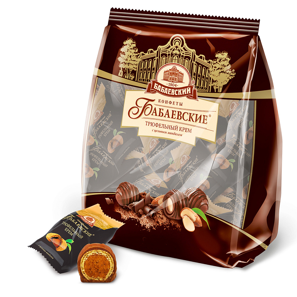 Конфеты Бабаевские трюфельный крем - вафельные шары с начинкой из трюфельного крема и цельного миндаля, покрытые шоколадной глазурью.