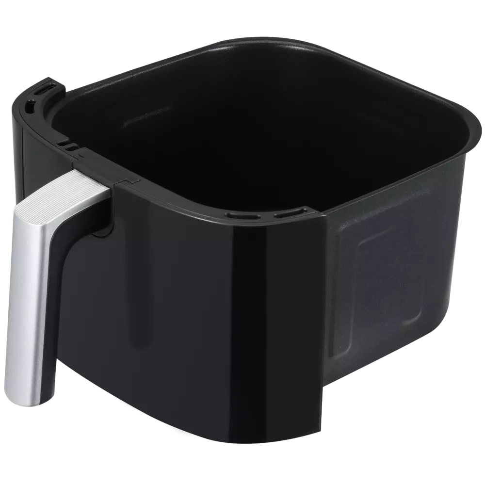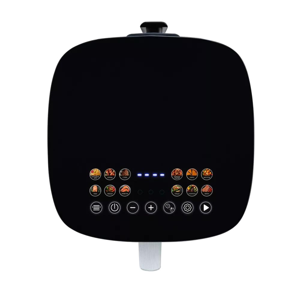 Оснащён сенсорным цветным дисплеем и 12 автоматическими программами: картофель фри, курица, куриные крылья, стейк, рыба, овощи, пирог, пицца, суфохрукты, наггетсы, бекон и креветки.