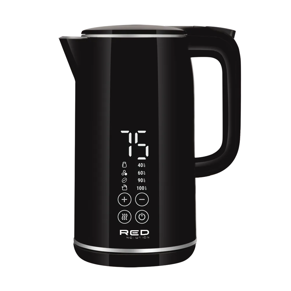 Электрический чайник RED SOLUTION RK-M1301D — устройство мощностью 1800–2200 Вт со встроенной функцией выбора температуры нагрева воды, автоматическим поддержанием заданной температуры, сенсорной панелью управления и светодиодным дисплеем. Минималистичный дизайн без лишних деталей делает прибор органичным аксессуаром в интерьере.