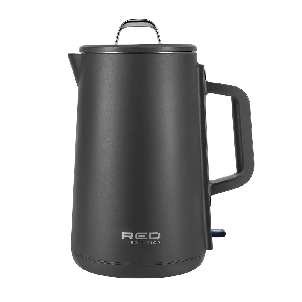 RED SOLUTION AM102 — электрический чайник в строгом минималистичном дизайне. Матовый корпус цвета графита и хромированная ручка дополнят кухонную фурнитуру и бытовую технику. Благодаря двойной стенке вода в чайнике остывает медленнее, а корпус не нагревается.