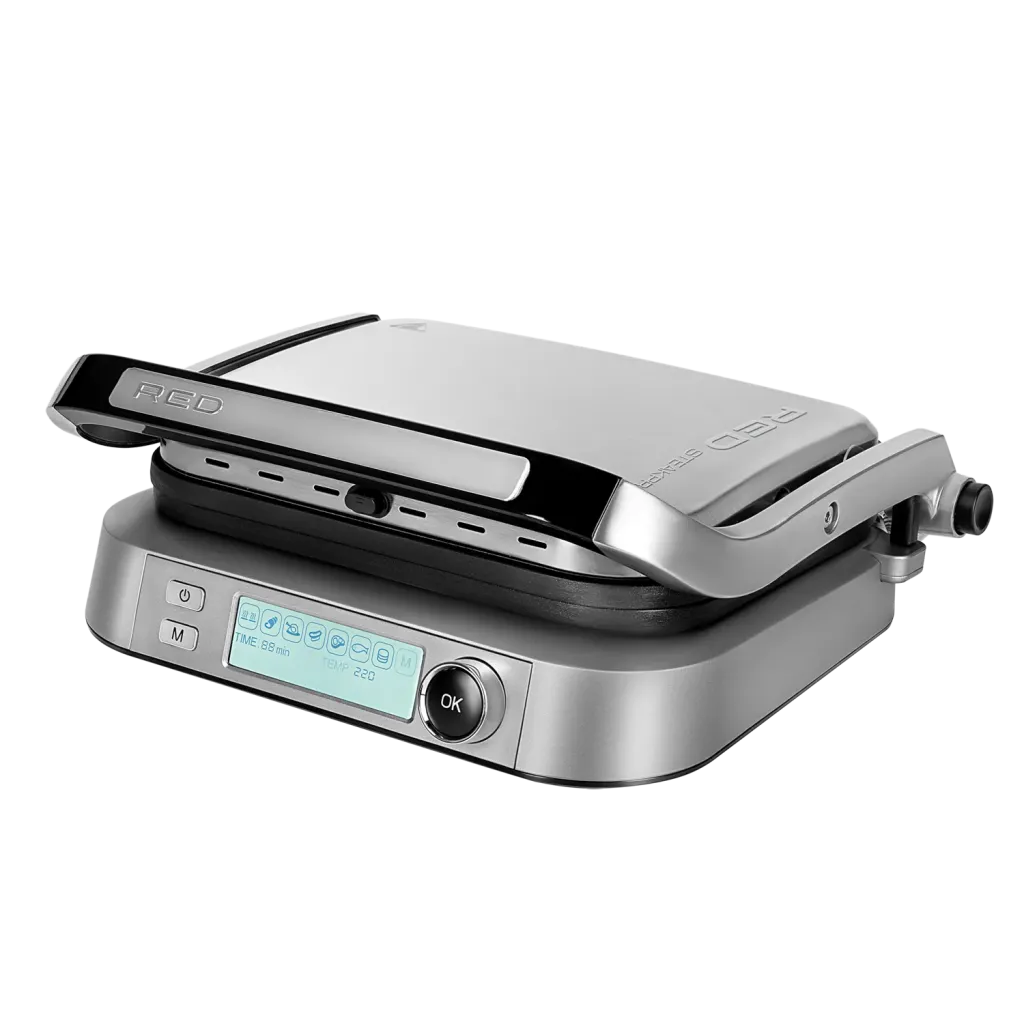 RED SOLUTION SteakPRO RGM-816P — гриль 3 в 1, который объединяет в себе функции прижимного гриля, духовки и барбекю. Устройство разогревается до максимальной температуры 230°C за 5 минут. Гриль оснащен семью автоматическими программами для экономии сил и времени. Автоматическое определение толщины стейка, индикация степени прожарки гарантируют всегда желаемый результат. Встроенные в панель нагревательные элементы отвечают за равномерное приготовление продуктов, а антипригарное покрытие позволяет не использовать масло. Съемные панели и поддон делают очистку легкой. Книга от бренд-шефа с 55 рецептами поможет раскрыть кулинарный потенциал устройства.