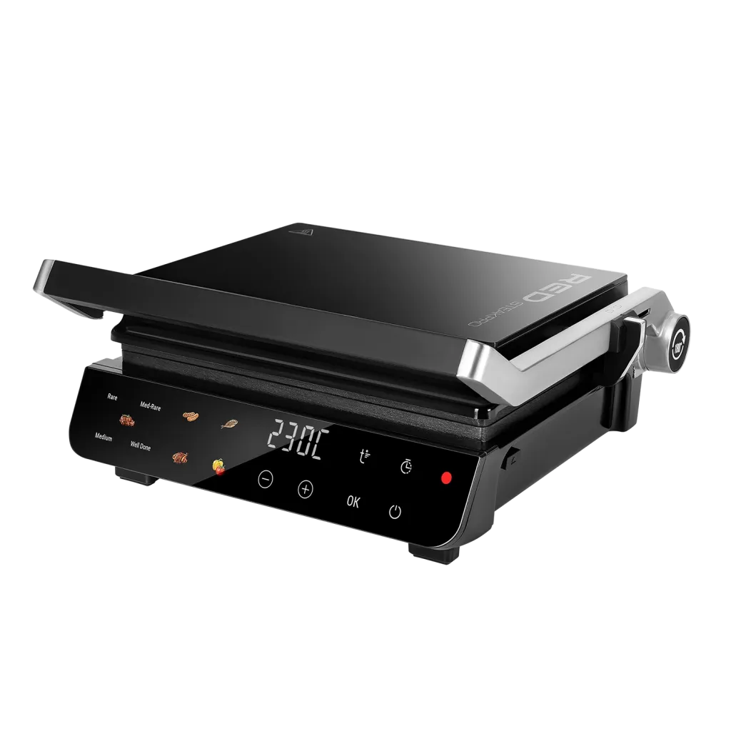RED COLORSENSE SteakPRO G830D — футуристичный электрогриль мощностью 2000 Вт с сенсорным управлением. Устройство можно использовать как барбекю или мини-духовку. Крышка G830D выполнена из закаленного стекла — благодаря гладким граням гриль смотрится современно и лаконично. Модель имеет 5 авторежимов, автоматическое определение толщины стейка и индикацию степени прожарки. Забудьте о привычной рутинной готовке с RED SOLUTION!