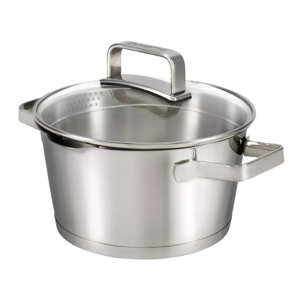 Крышка из жаропрочного стекла с отверстием для выпуска пара и специальным широким металлическим ободом с отверстиями для удобного слива жидкости.