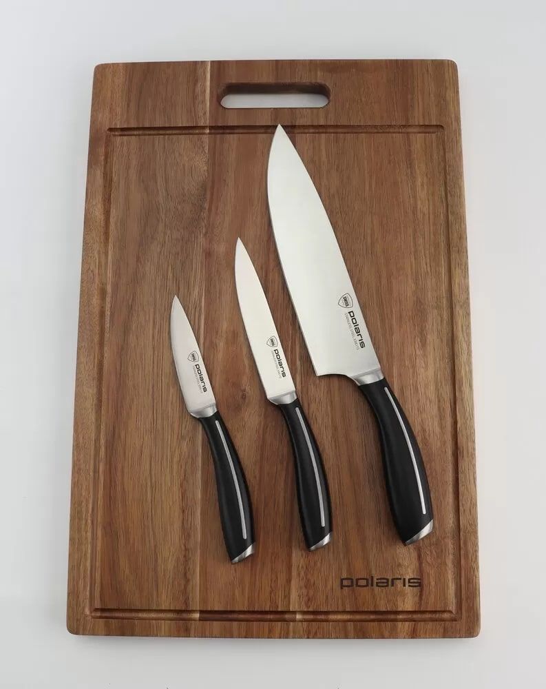 Преимущества набора ножей Polaris - двусторонняя заточка лезвий. Благодаря этому, ножи позволяют вам быстро и аккуратно нарезать продукты. Материал изделий - нержавеющая сталь X30Cr13, что гарантирует его долговечность и стойкость к коррозии.