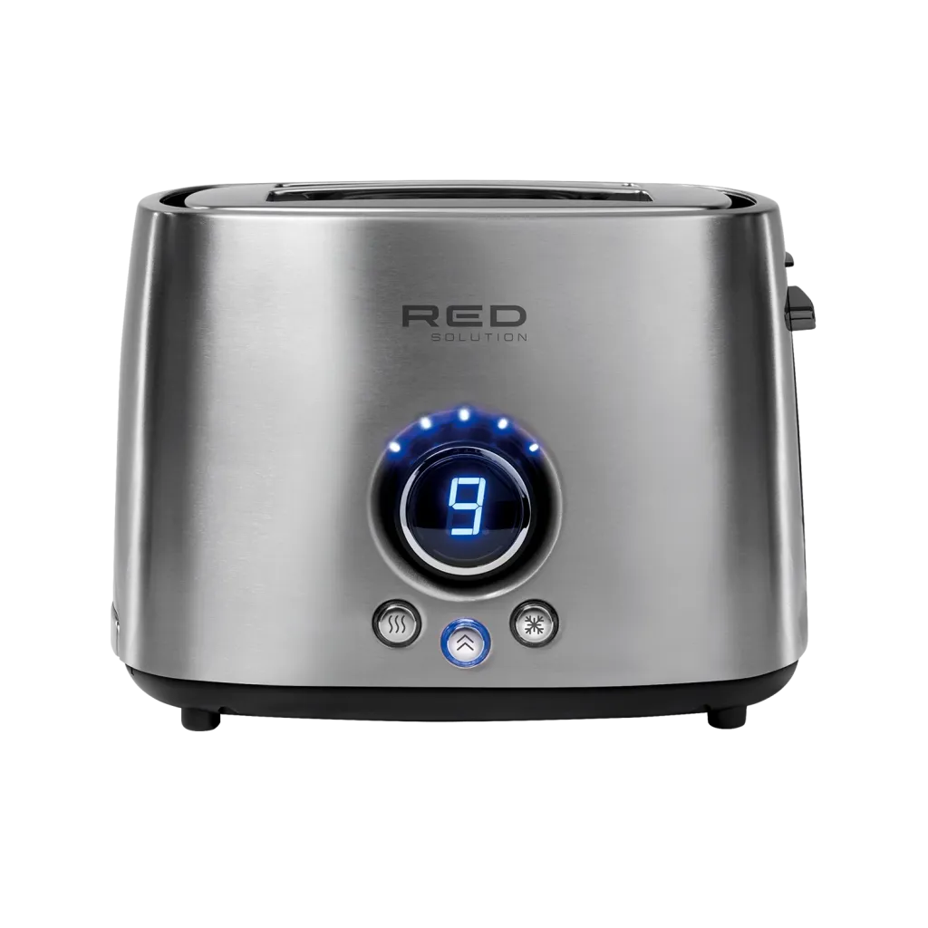 Тостер RED SOLUTION RT-M403 оснащен дисплеем, который показывает выбранную степень поджаривания тостов. Светодиодная индикация наглядно отображает обратный отсчет времени обжаривания. Для приготовления тостов из замороженного хлеба предусмотрена функция разморозки (тостер размораживает хлебные ломтики, а затем автоматически переключается в режим обжаривания). При помощи функции разогрева можно подогреть остывшие тосты или, используя специальную подставку, булочки, круассаны и т. п.