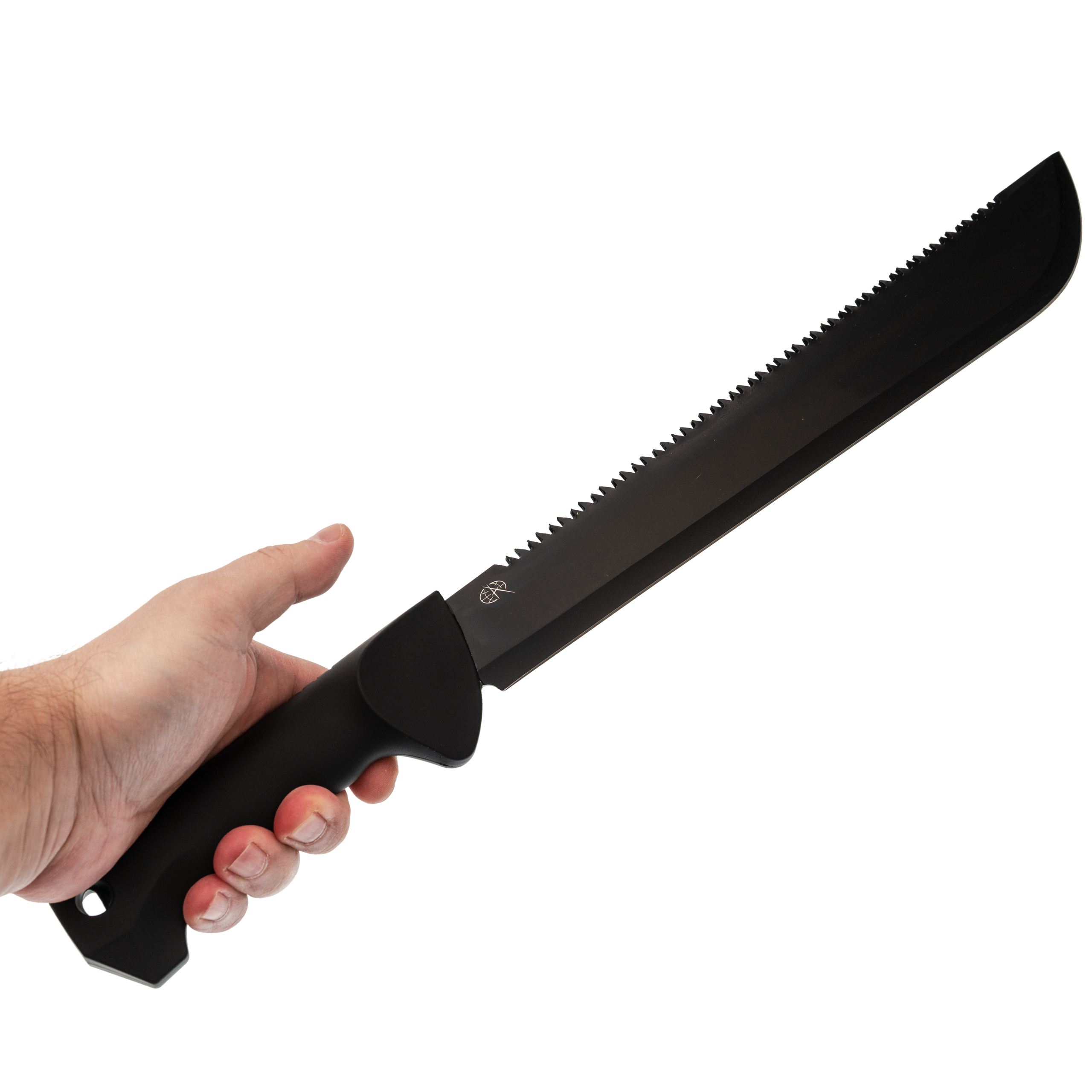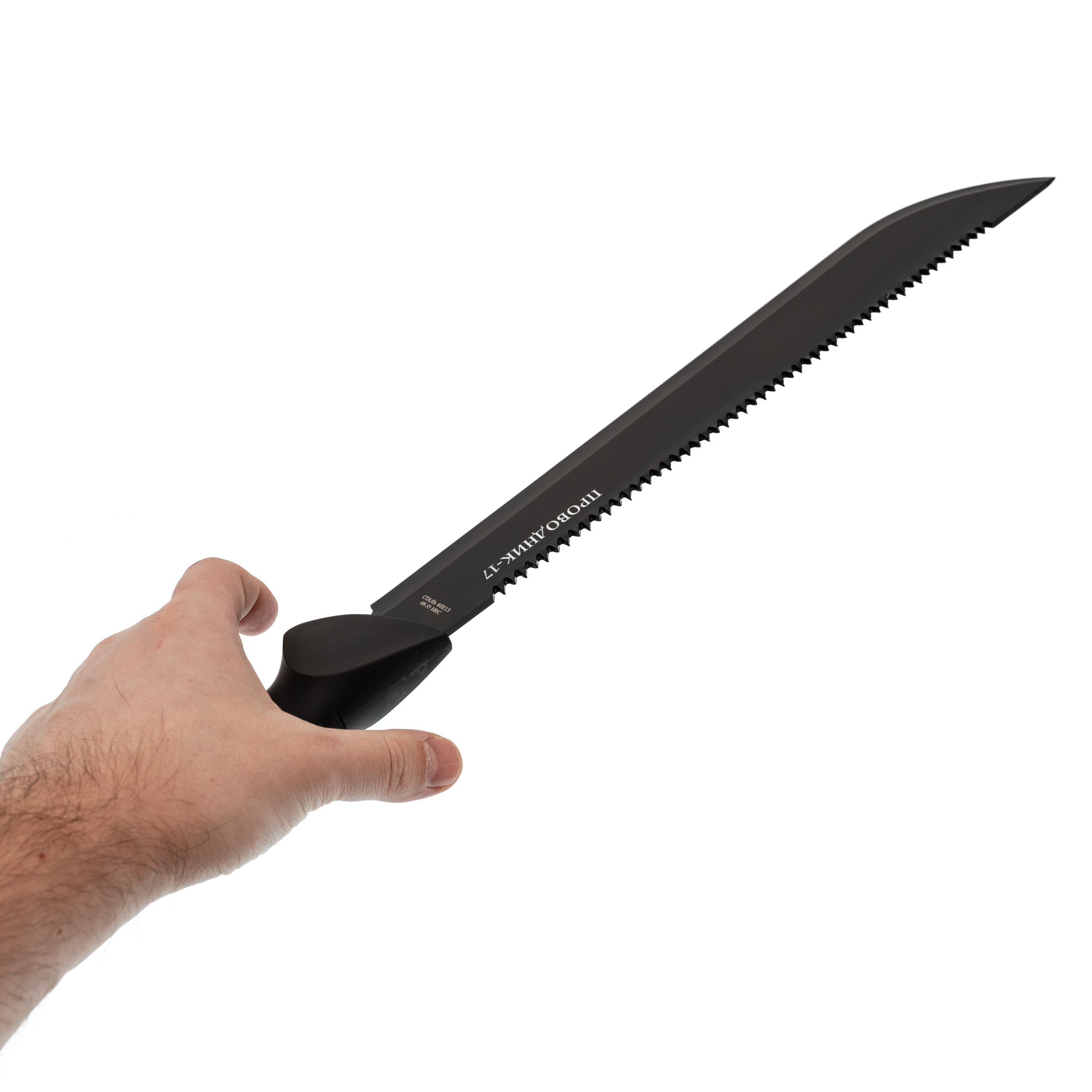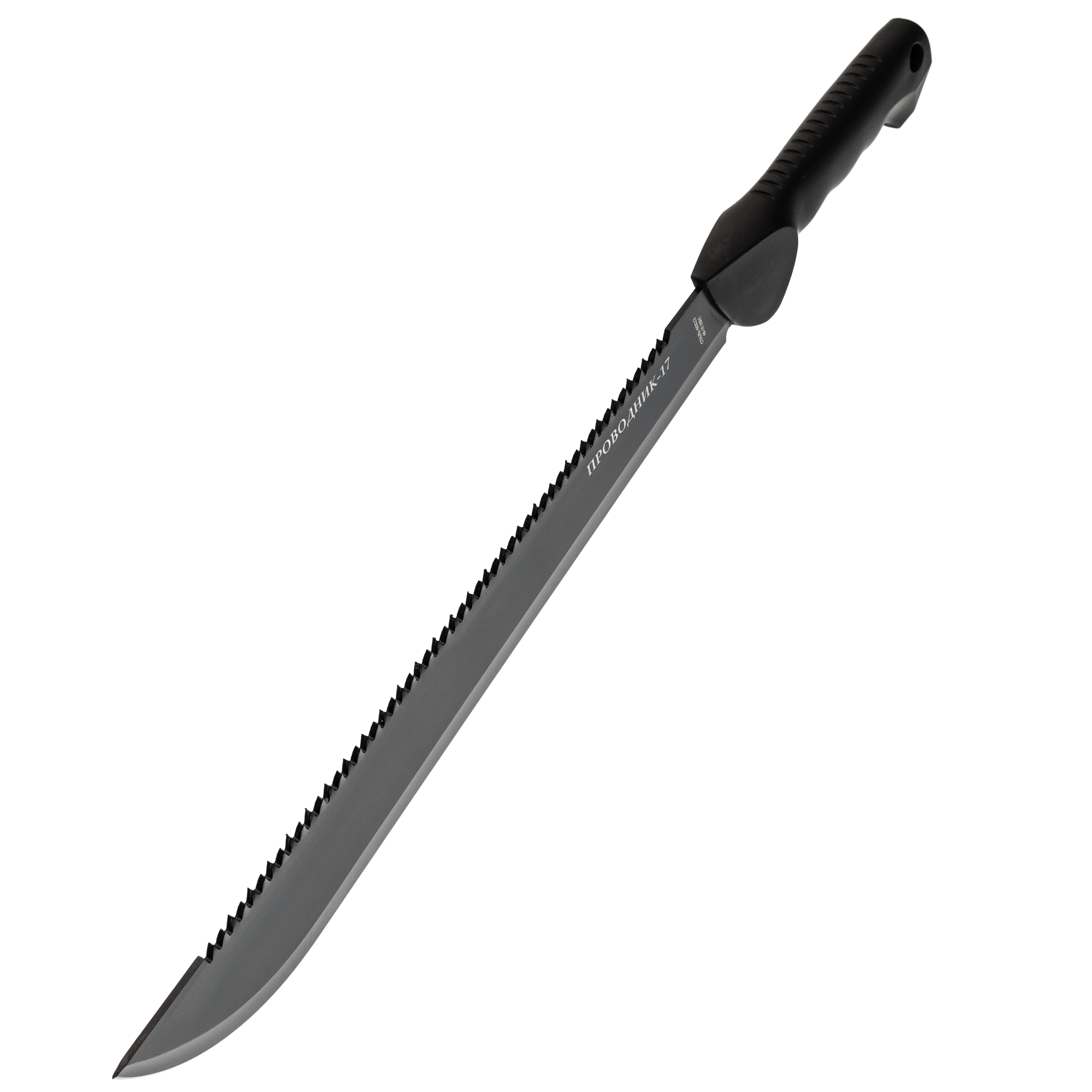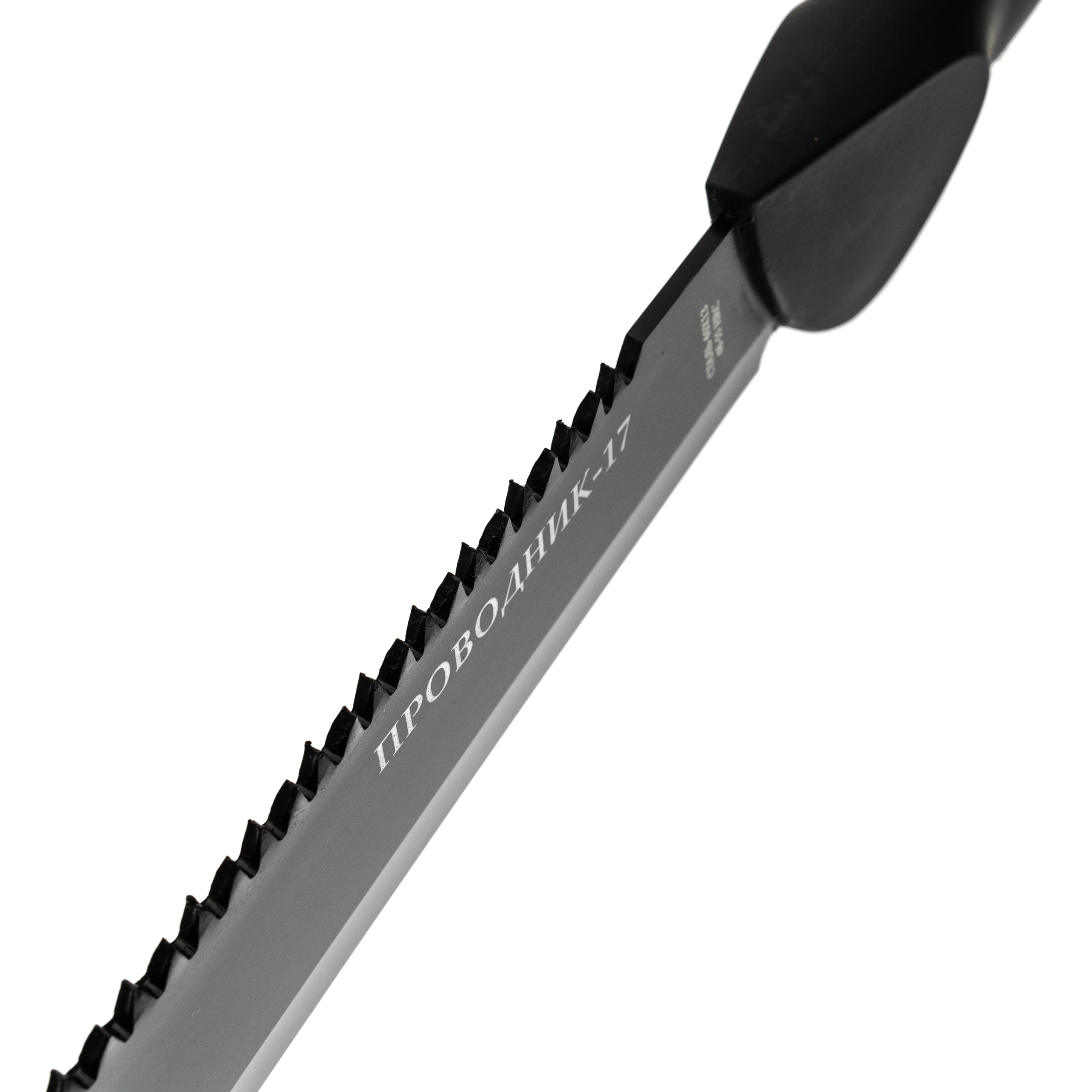 Клинок у модели Проводник-17 - длинный, тонкий и гибкий, что делает его особенно удобным при расчистке растительности. Обух оснащён пилой, полезной для обработки более плотных участков. Поверхность клинка покрыта чёрным защитным слоем, который снижает блики и дополнительно повышает устойчивость к коррозии, особенно при использовании в условиях высокой влажности.
