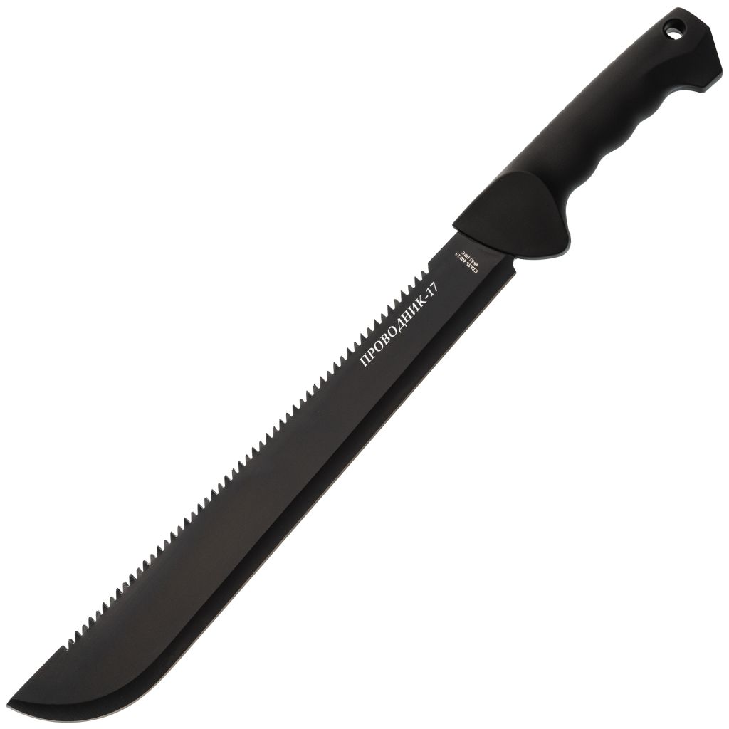 Клинок у модели Проводник-17 - длинный, тонкий и гибкий, что делает его особенно удобным при расчистке растительности. Обух оснащён пилой, полезной для обработки более плотных участков. Поверхность клинка покрыта чёрным защитным слоем, который снижает блики и дополнительно повышает устойчивость к коррозии, особенно при использовании в условиях высокой влажности.