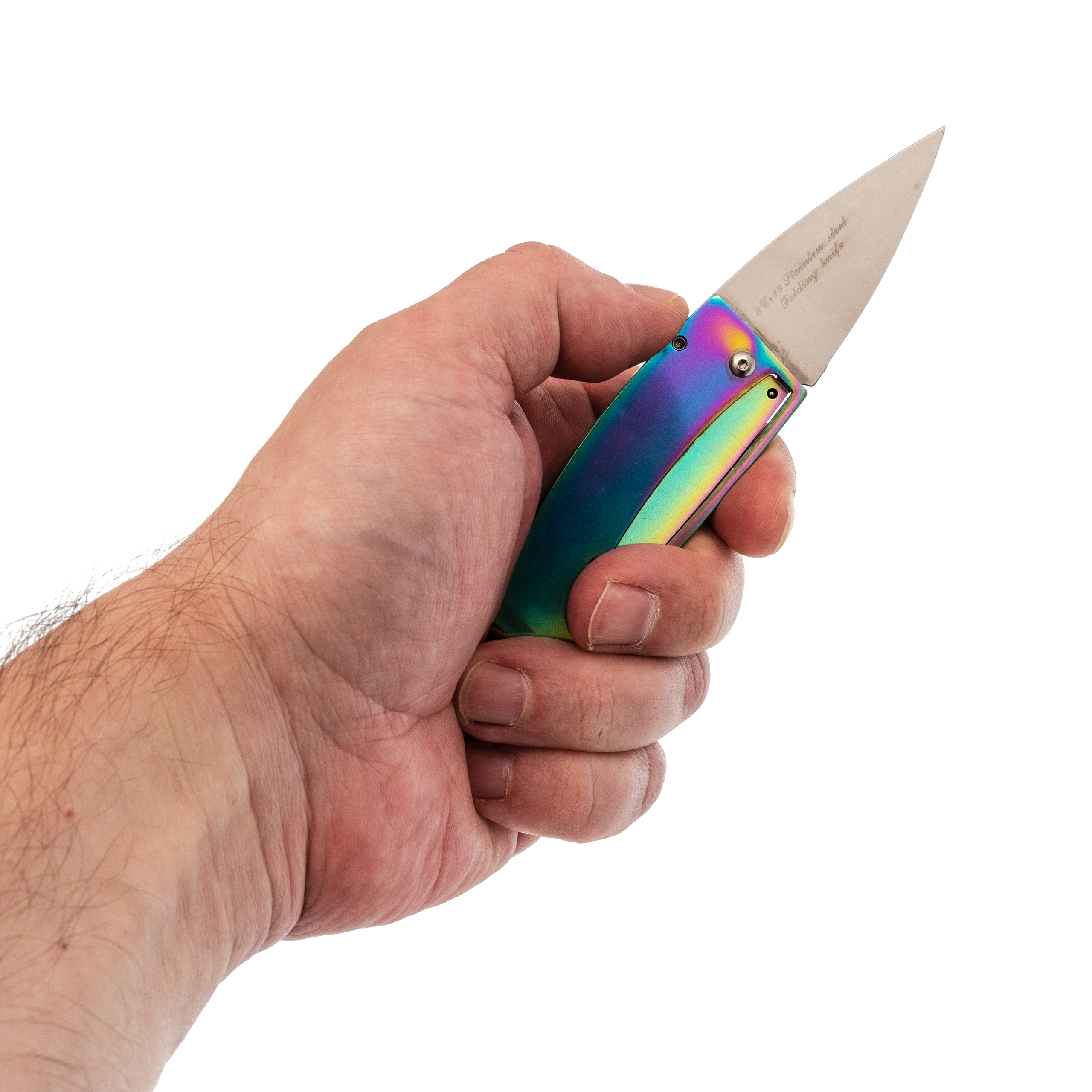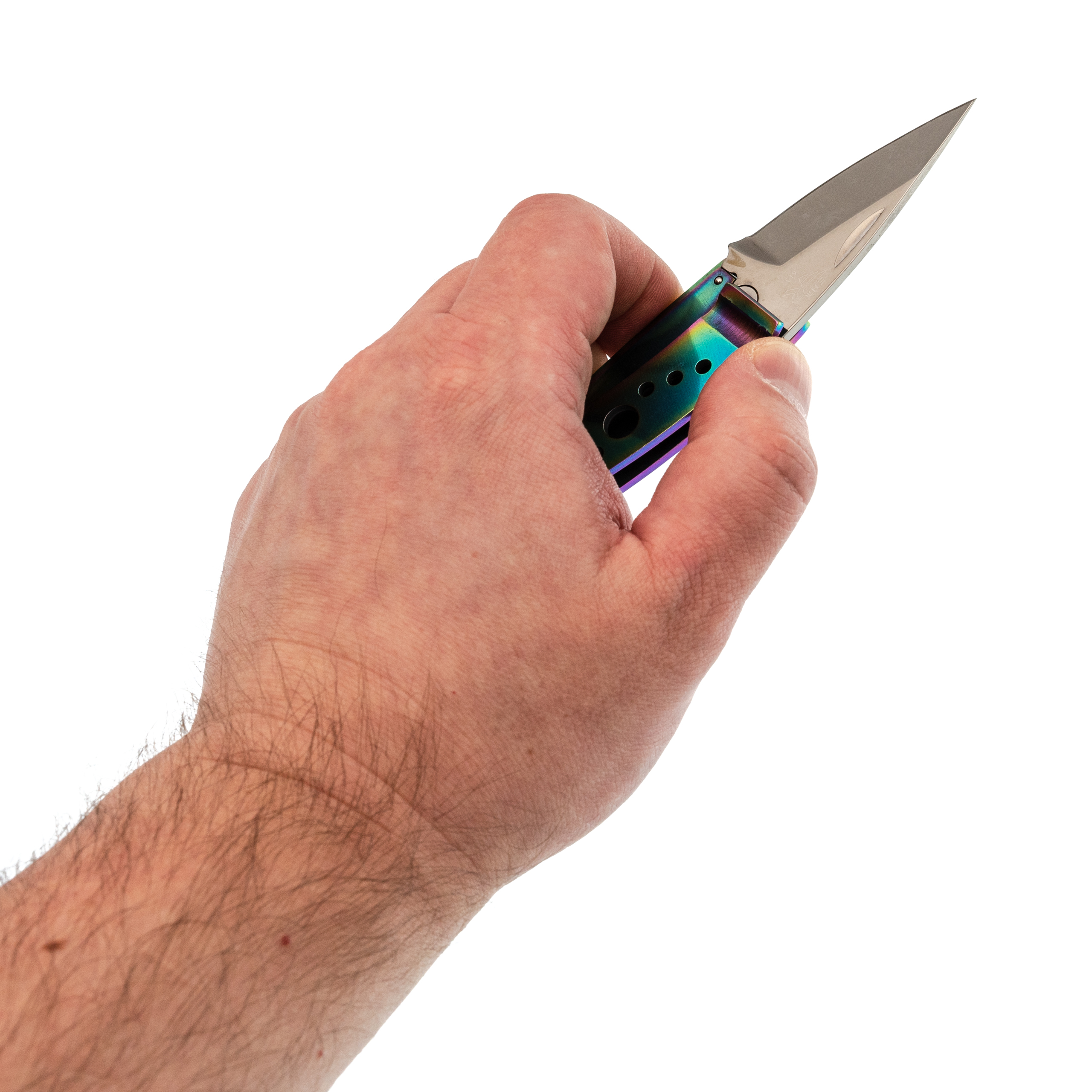 Профиль клинка - Spear-Point. Благодаря симметричным спускам и чётко выраженному острию, нож одинаково хорош и для аккуратного реза, и для прокола (например, если нужно проткнуть плотную упаковочную плёнку или картон). Здесь использован стамесочный (односторонний) спуск. Да, с точки зрения геометрии он не так хорош для тонкой шинковки, как европейский вогнутый спуск, но для ежедневных мелочей - обрезать нитку, открыть коробку - его возможностей вполне достаточно. Открывается клинок классическим способом: за ногтевой зацеп. Это надёжно, просто и исключает случайное раскладывание в кармане.