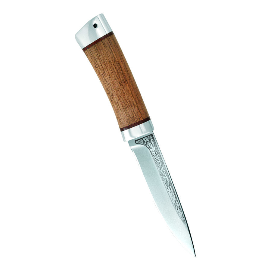 Средний по размерам, универсальный, легкий и прочный нож с клинком, имеющим чуть приспущенный к острию обушок. Вогнутые линзовидные спуски от половины ширины клинка образуют тонкое, изумительно режущее лезвие. Толщина обуха в 2,4 мм позволяет оставить приличную голомень, что придает ему дополнительную прочность. Клинок имеет довольно острый угол острия, что прекрасно подходит для вспарывания брюшка рыбы любой величины, через отверстие движением от себя в сторону нижней челюсти. Эргономичная форма рукояти идеально ложится в любую ладонь. Монтаж клинка сквозной, неразборный. На навершии рукояти имеется отверстие под темляк. Замечательный выбор для любителей рыбной ловли.