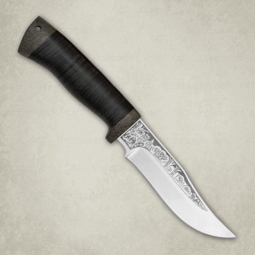 Мультифункциональный нож Клычок – 1, кожа, 95Х18, это хорошее приобретение для активного отдыха, туризма и лесных работ.Кожаная рукоять коричневого цвета и удобной эргономичной формы, позволяет максимально контролировать нож при работе, а гарда защищает от порезов.Лезвие с необычными узорами придает клинку изюминку, а хорошие режущие свойства обеспечивают вогнутые спуски и изогнутый наконечник. Широкая голомень блокирует повреждения и не позволяет ножу сломаться.К ножу с легкостью крепится темляк, в целях удобной переноски. Приятным дополнением ко всему станут качественные кожаные ножны, паспорт и сертификат соответствия.