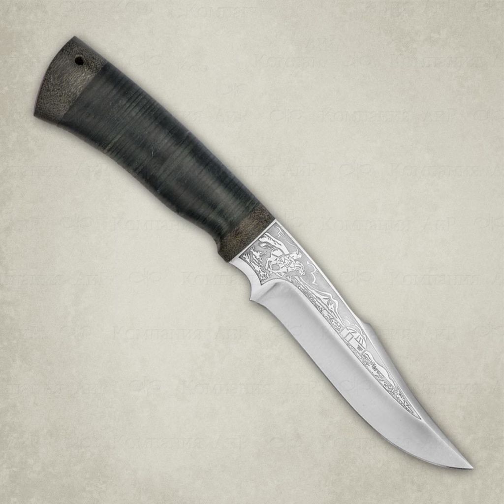 Средний универсальный прочный нож с хищным клинком восточного ятаганного вида, имеющим вогнутые линзовидные спуски от середины клинка, образующие тонкое, прекрасно режущее лезвие. Демонстрирует неплохие режущие качества. Весьма серьезный инструмент. Клинок толщиной обуха в 3 мм имеет прогнутое фальшлезвие двусторонней заточки, с углом заточки 60 градусов и может быть использовано для рубки мелких костей и хрящей. На пяте клинка есть подпальцевый вырез для указательного пальца. Форма рукояти удобна даже для большой руки, уверенно и прочно ложится в любую ладонь. Монтаж клинка сквозной, неразборный. На навершии рукояти имеется отверстие под темляк. Отличный выбор для большинства видов работы в лесу.