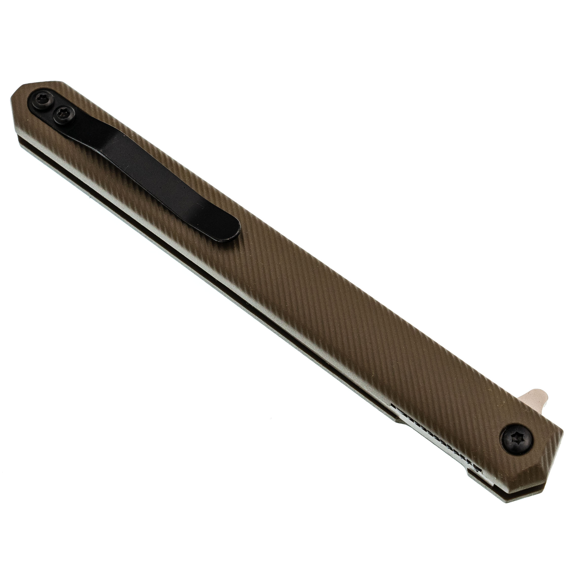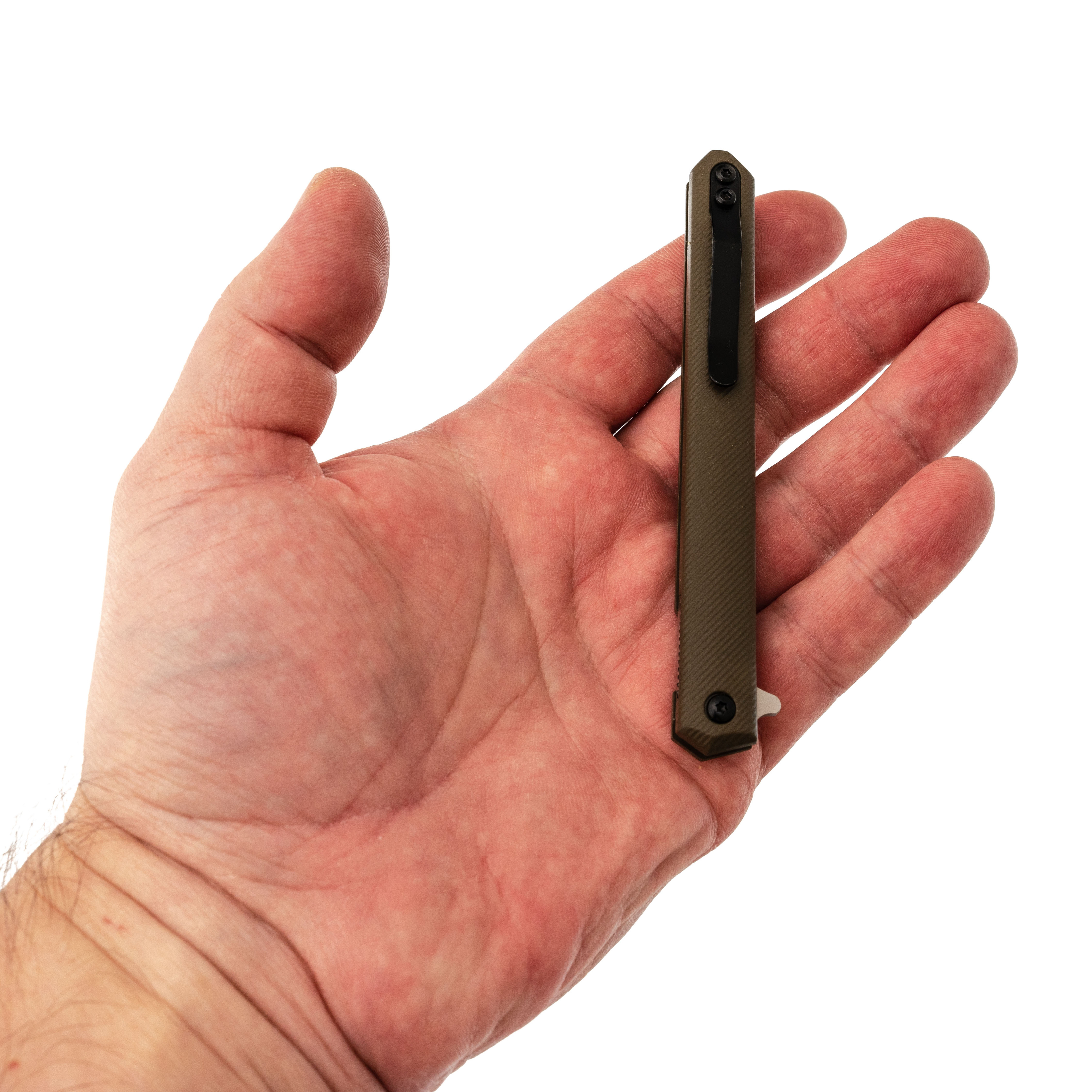 Клинок выполнен в профиле Tanto с прямыми спусками - геометрия, которая хорошо подходит для аккуратной работы по плотным материалам и позволяет уверенно контролировать рез. Отдельный плюс именно этой модели - крайне узкий клинок: он легко пролезает в щели, удобно поддевает край упаковки и даёт ощущение "скальпельной" точности там, где широкий клинок мешает. Открытие - за флиппер: быстро, привычно и удобно одной рукой.