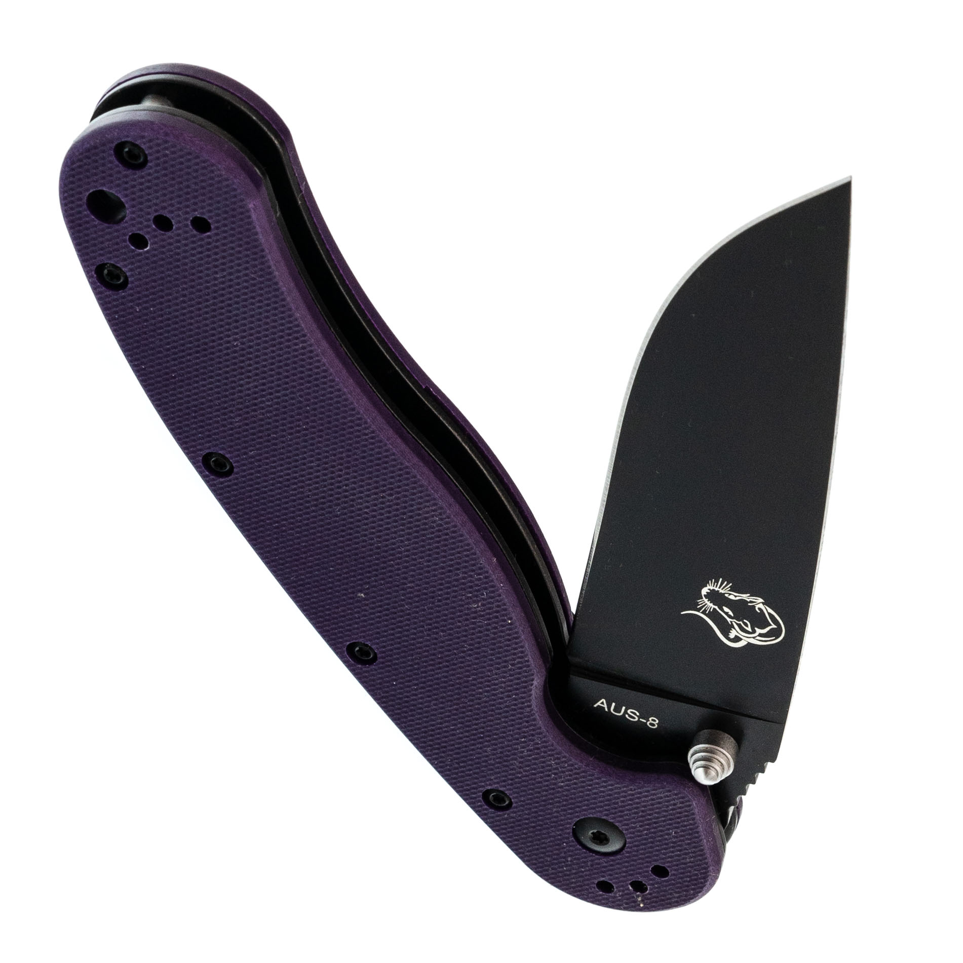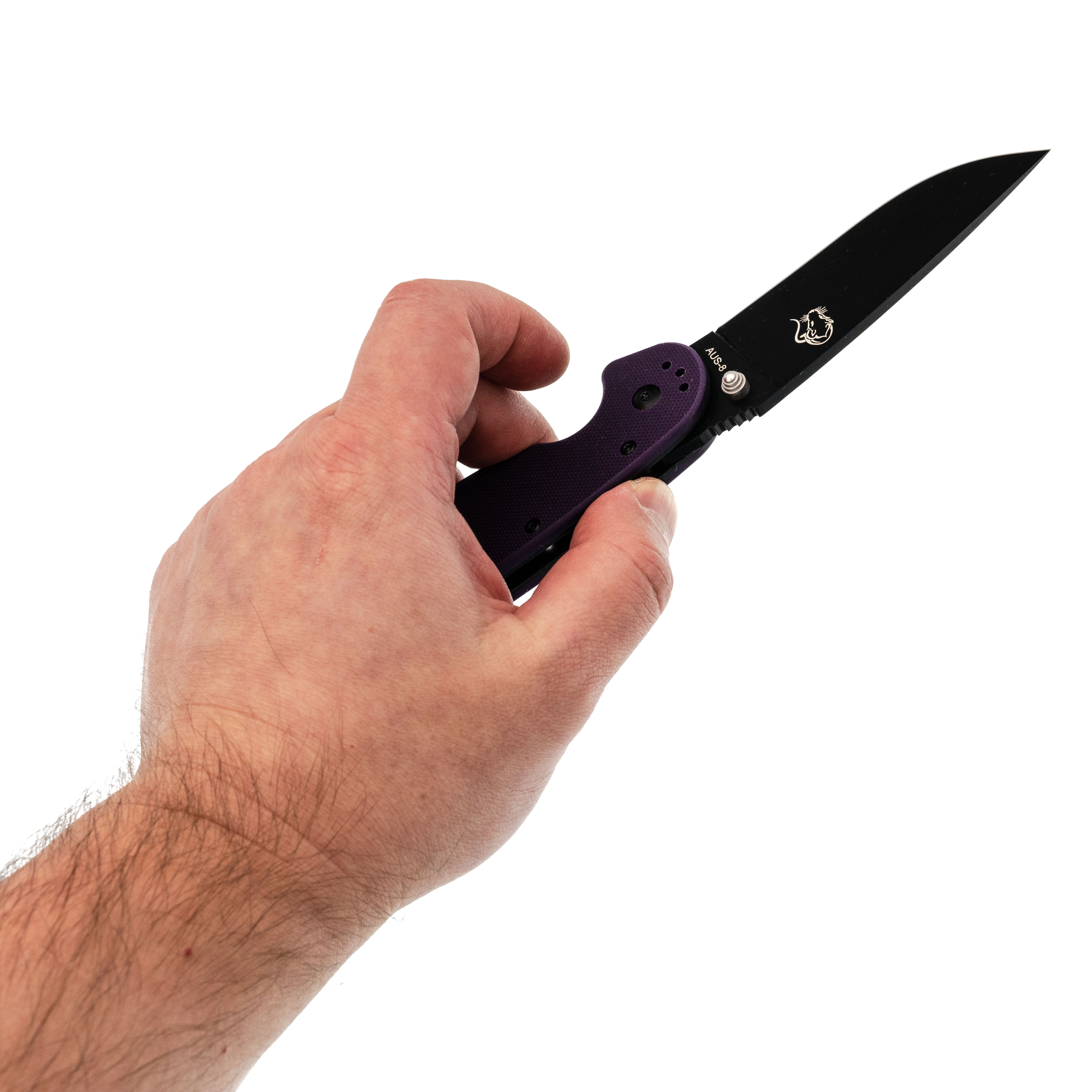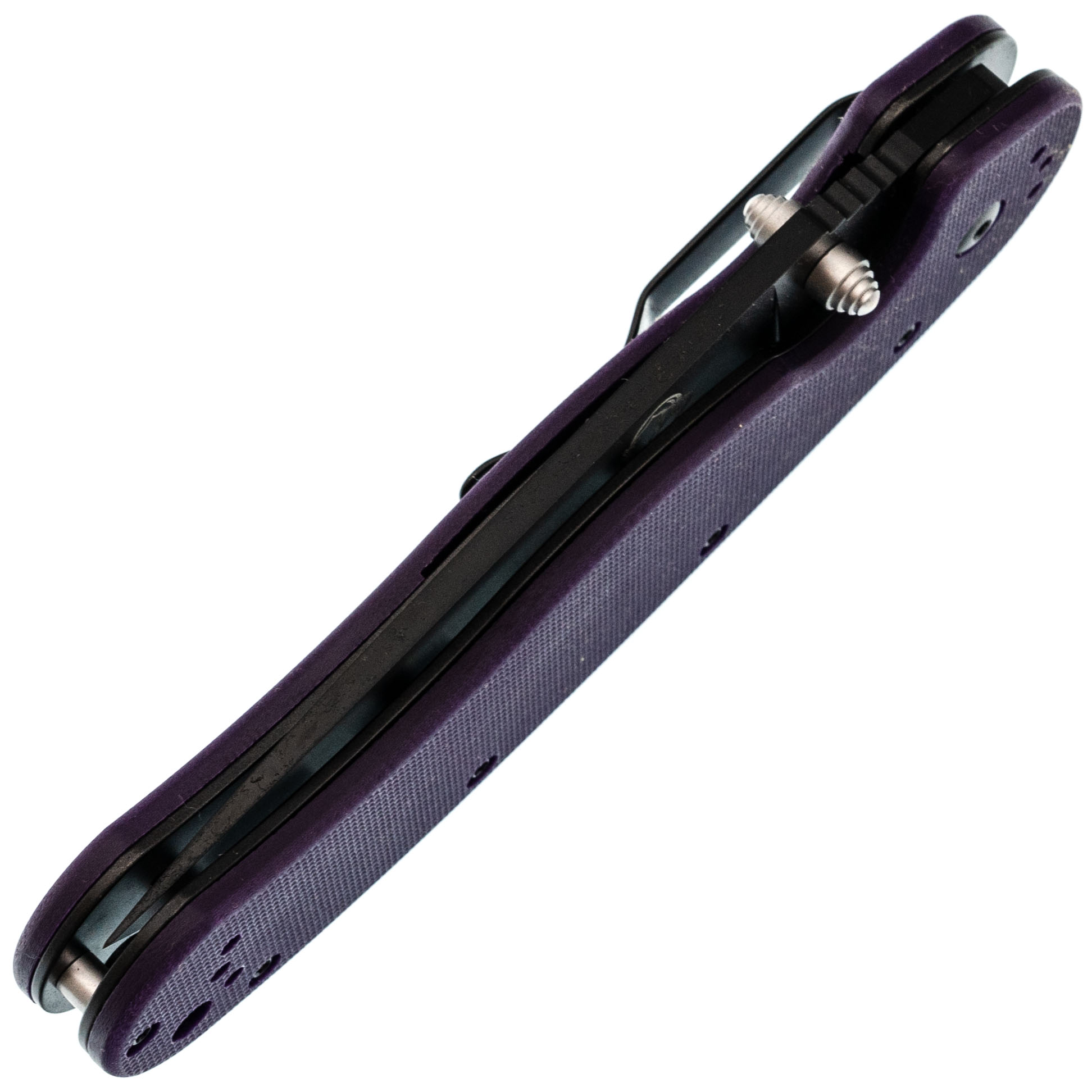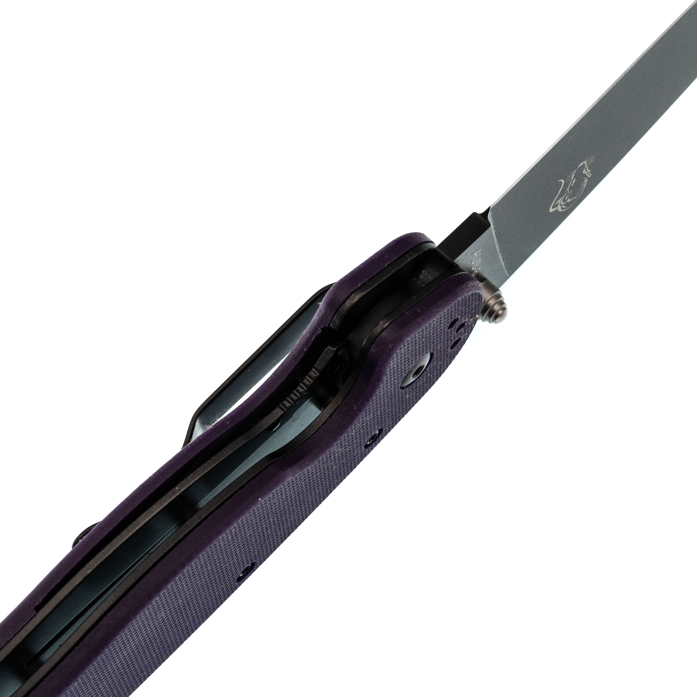 Рукоять из G10 фиолетового цвета - прочная и заметная, легко найти в снаряжении.