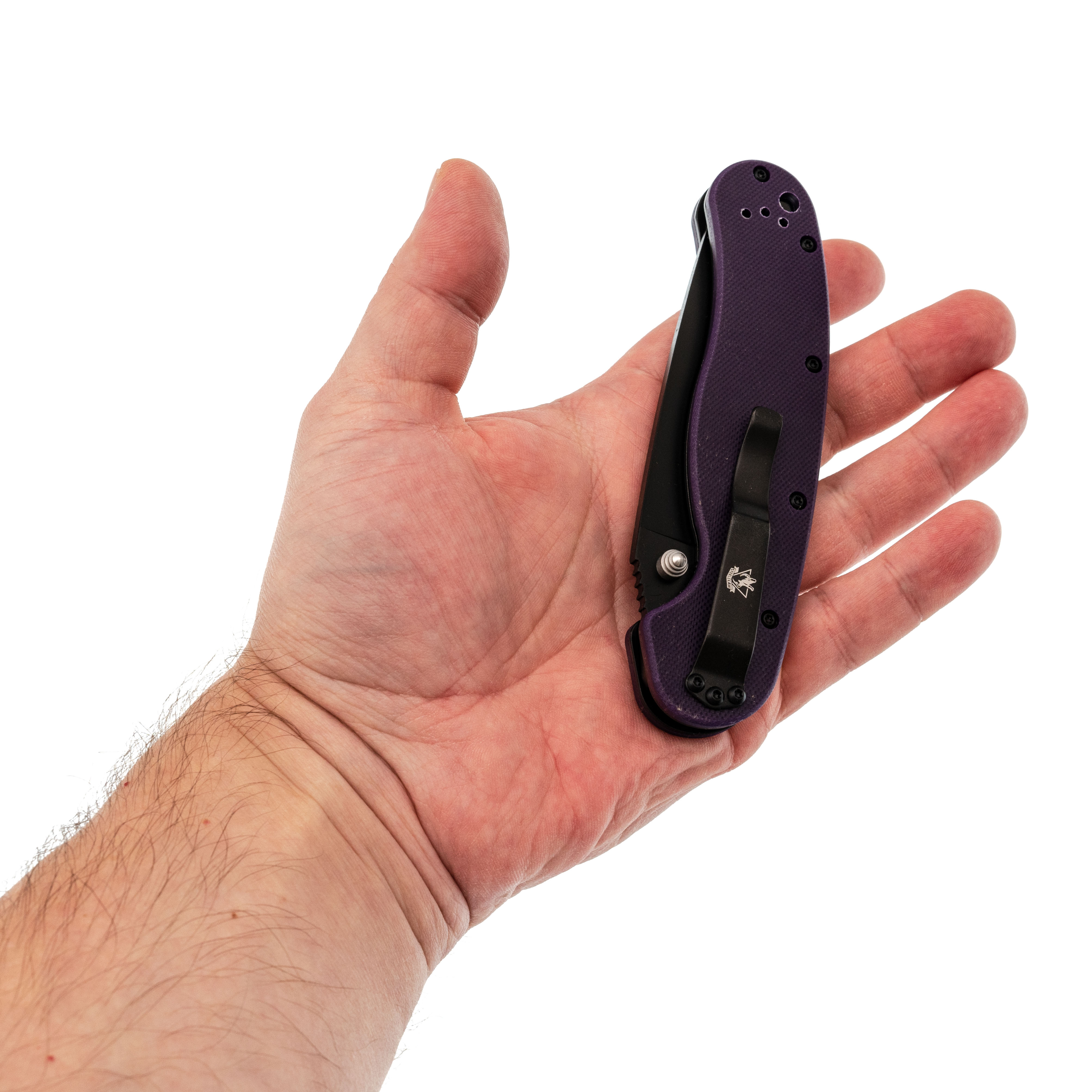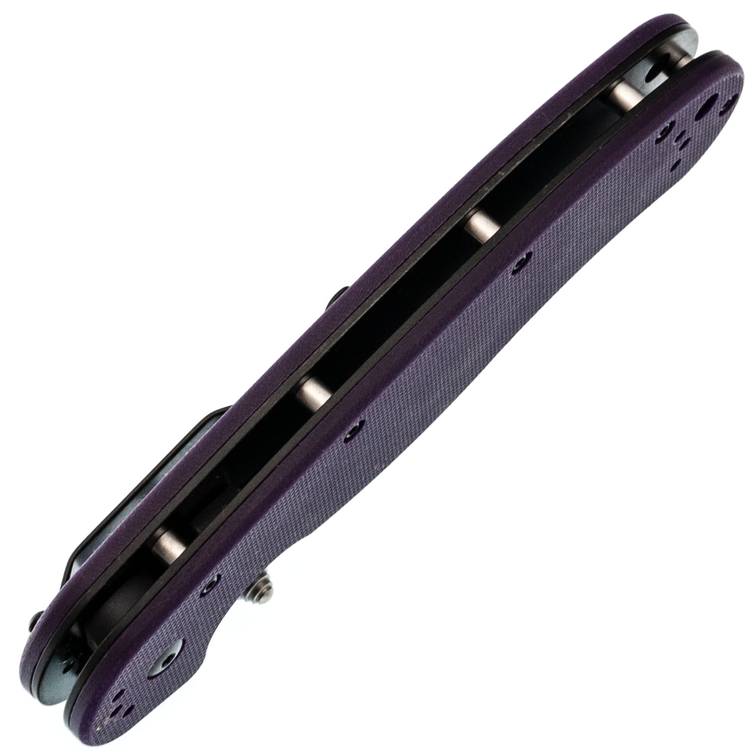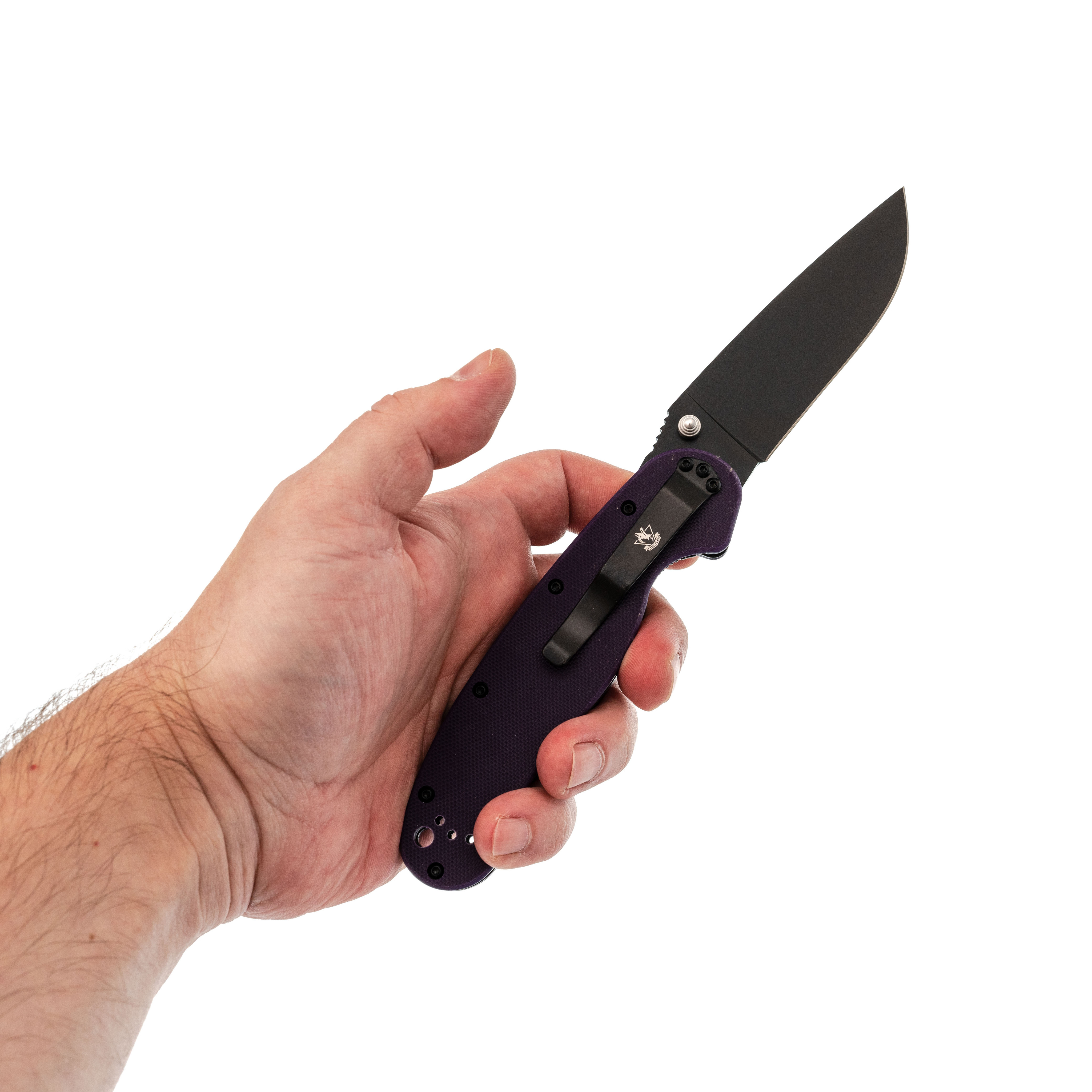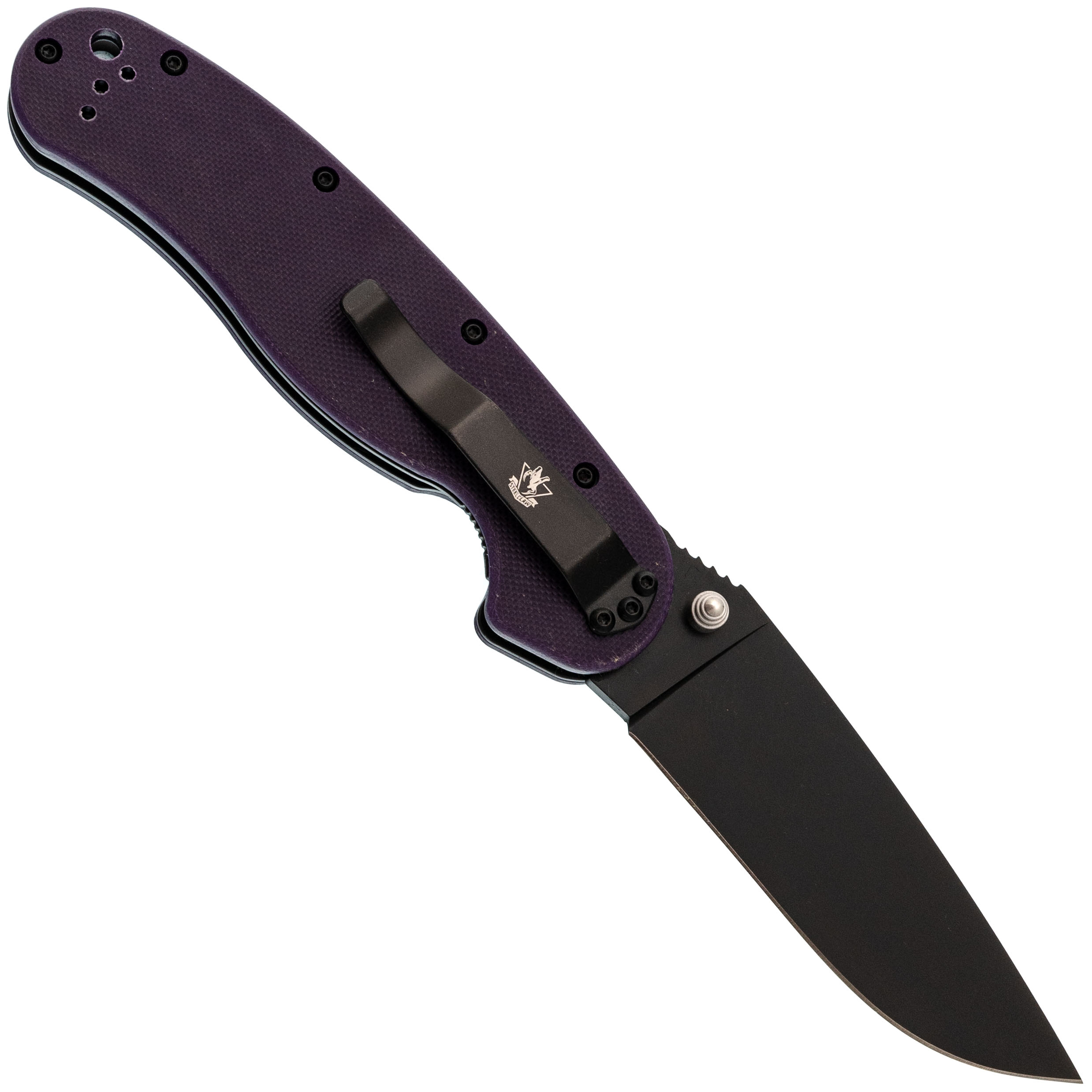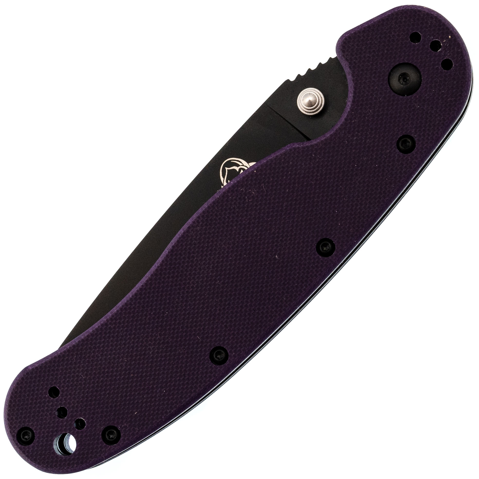 Рукоять из G10 фиолетового цвета - прочная и заметная, легко найти в снаряжении.