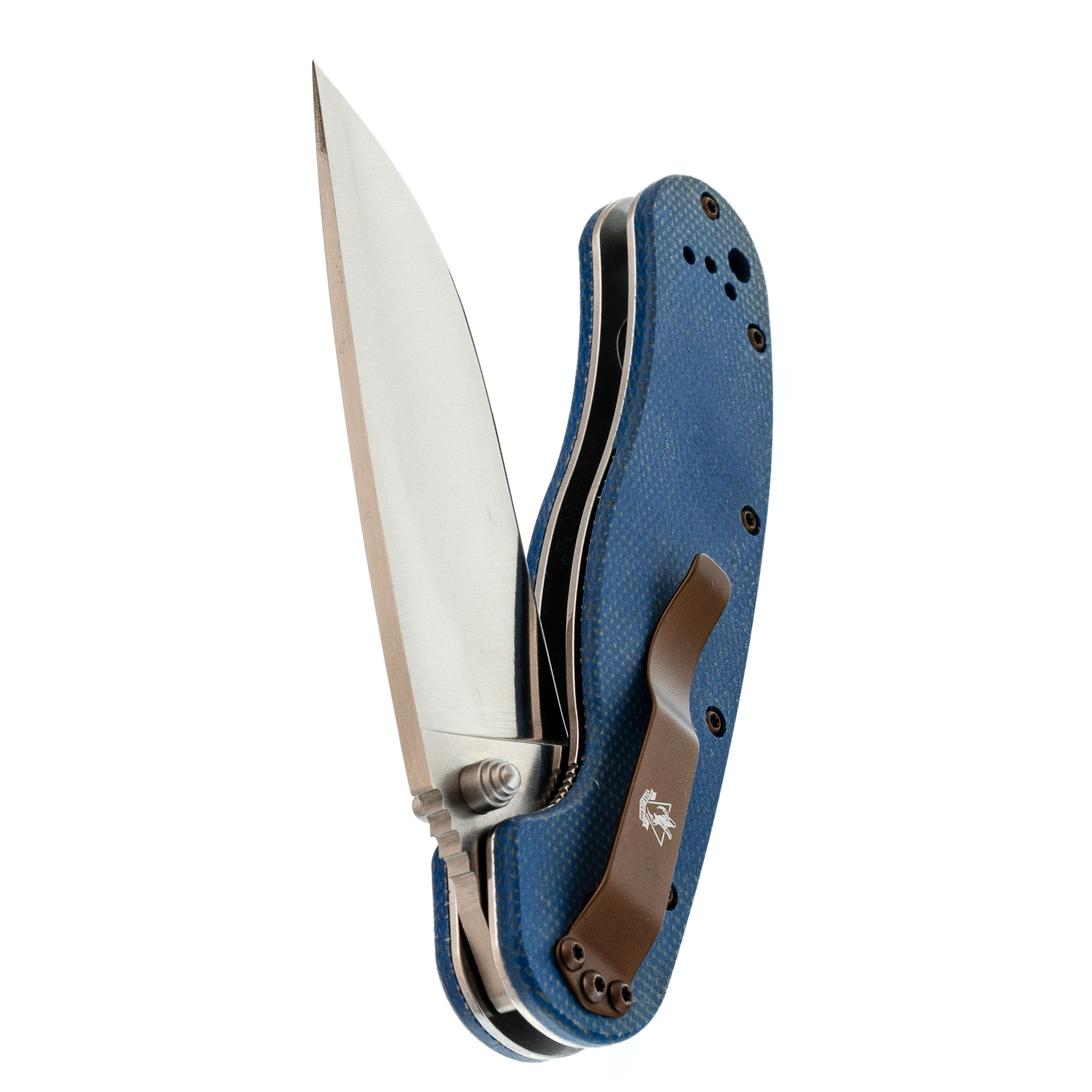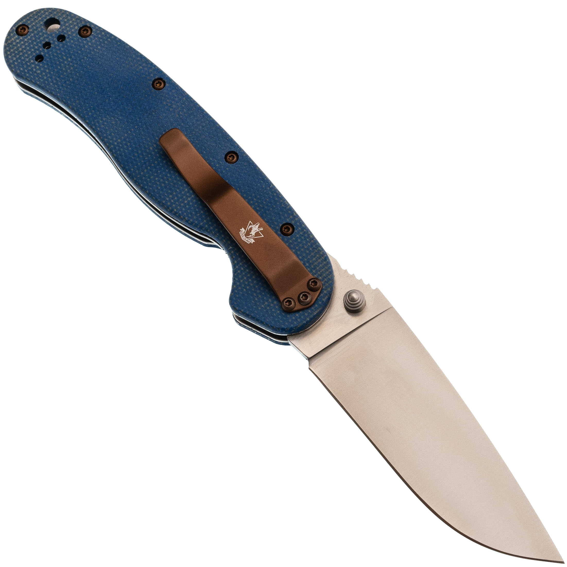 Drop-Point с прямыми спусками от обуха отлично режет и строгает. Клинок открывается шпеньками с обеих сторон, что удобно независимо от ведущей руки.