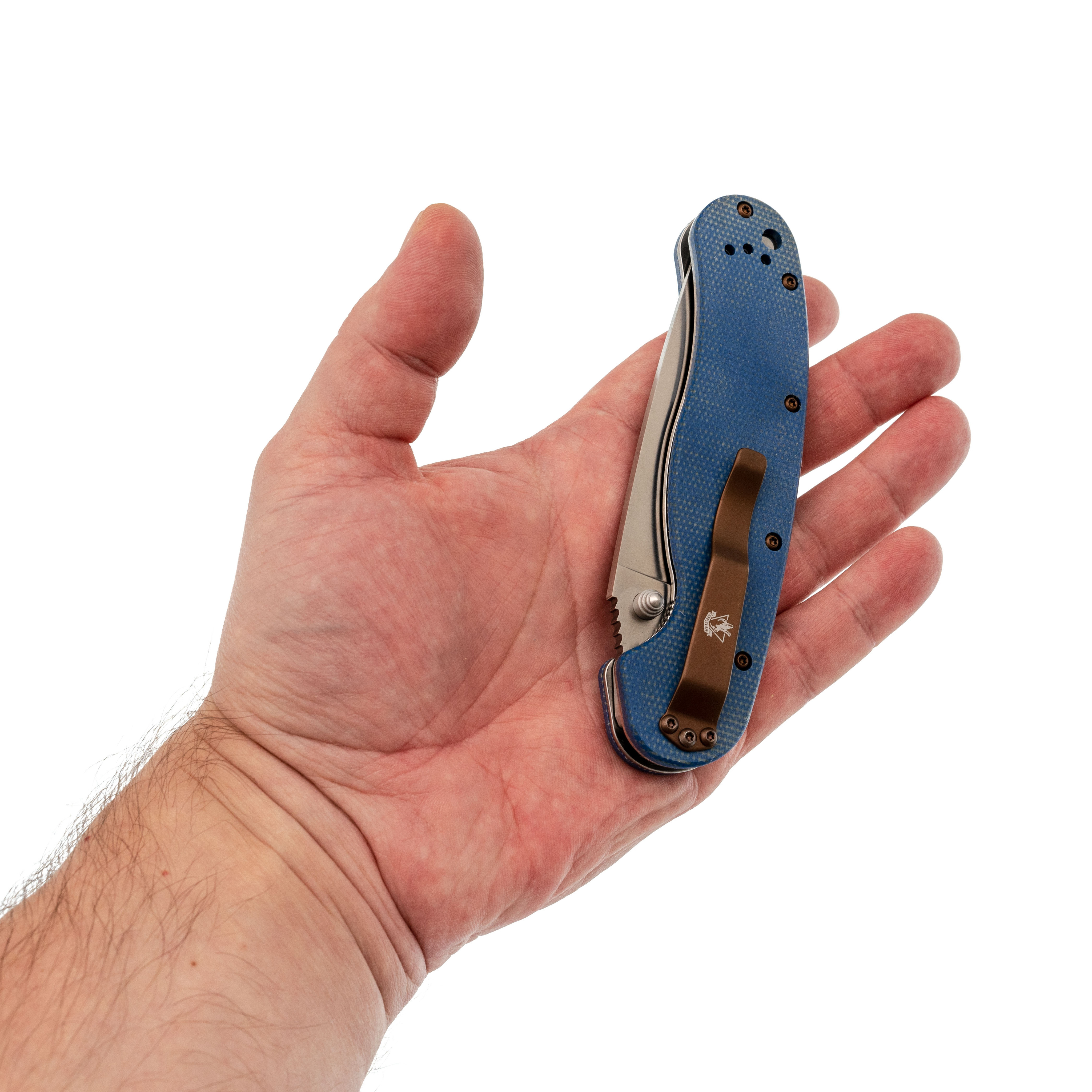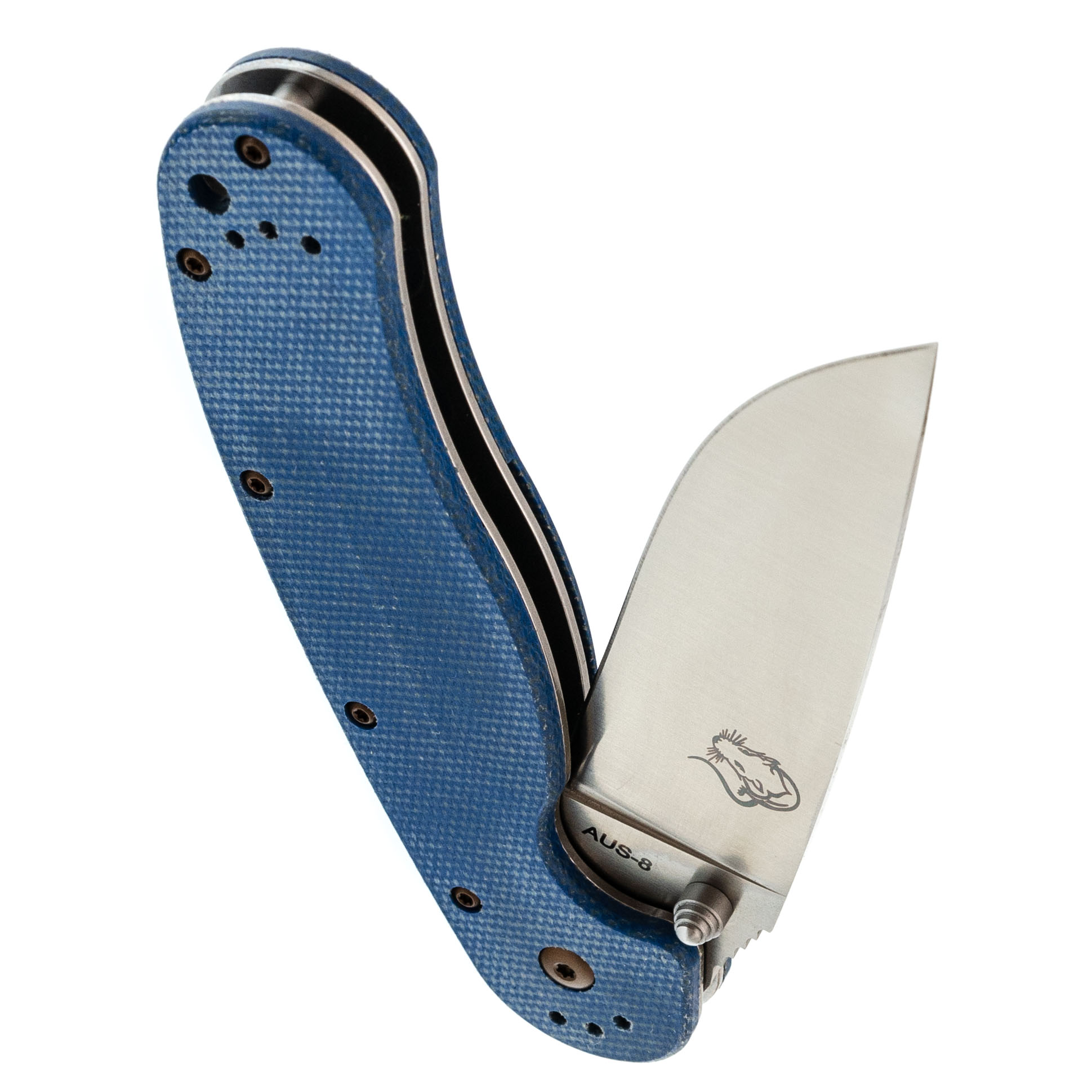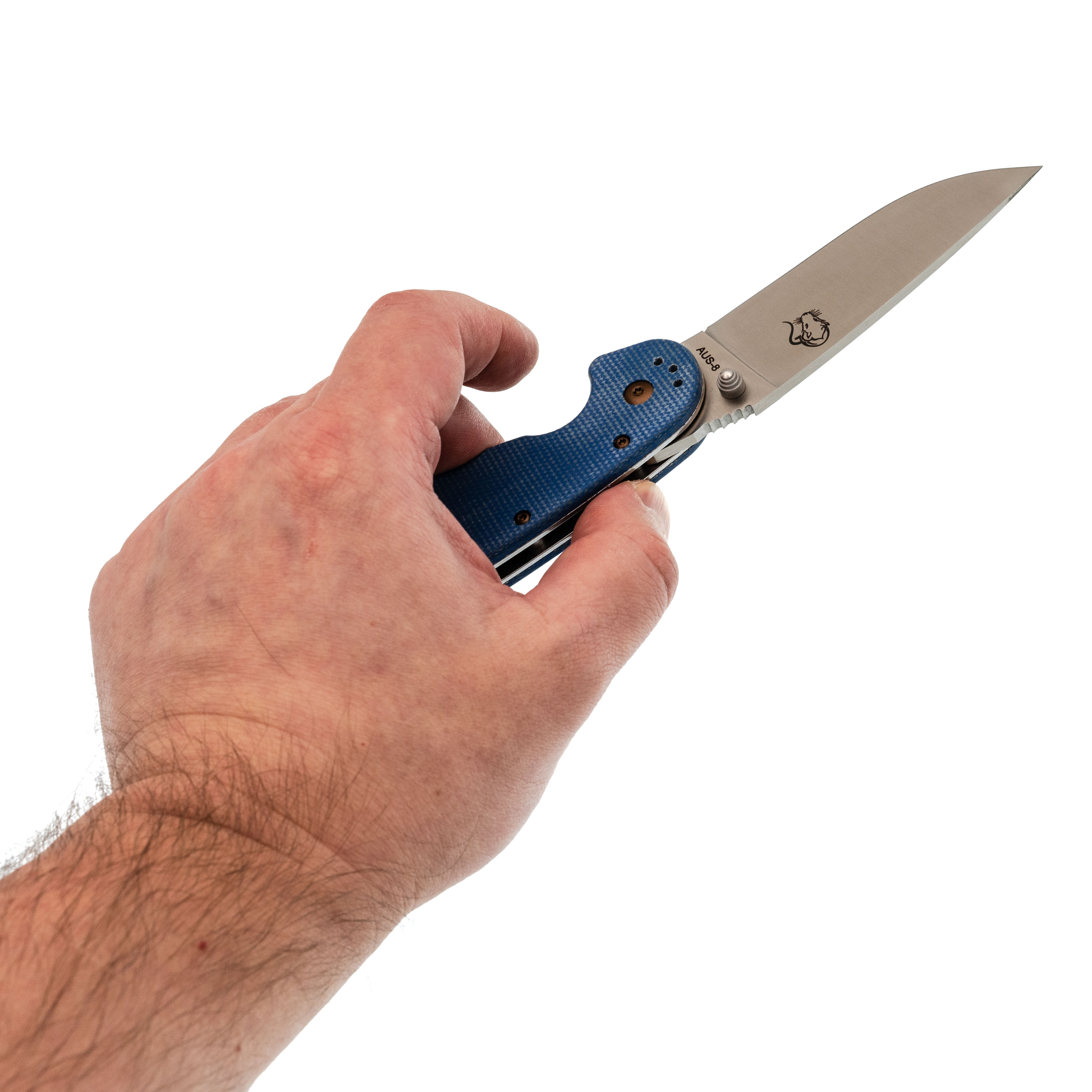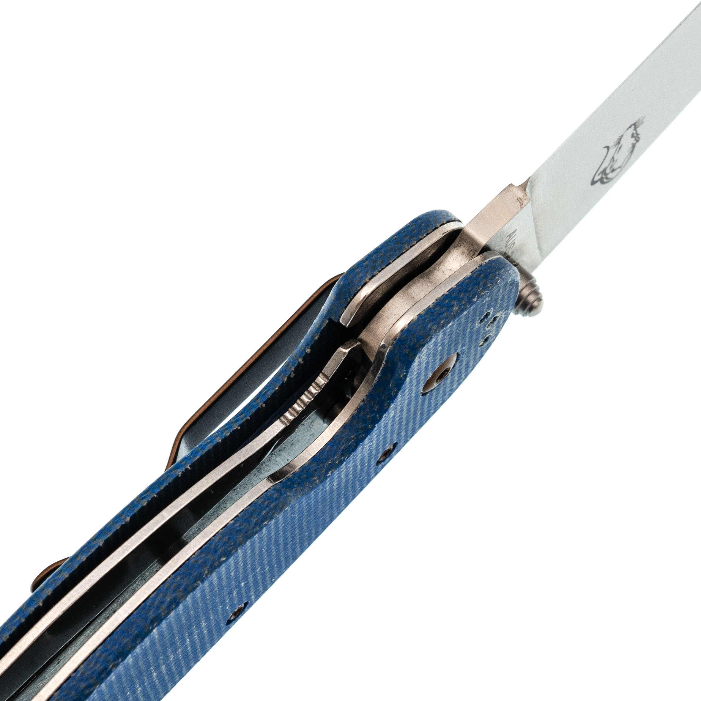 Рукоять из микарты синего цвета - тёплая на ощупь, хорошо держит хват, со временем приобретает индивидуальный оттенок.